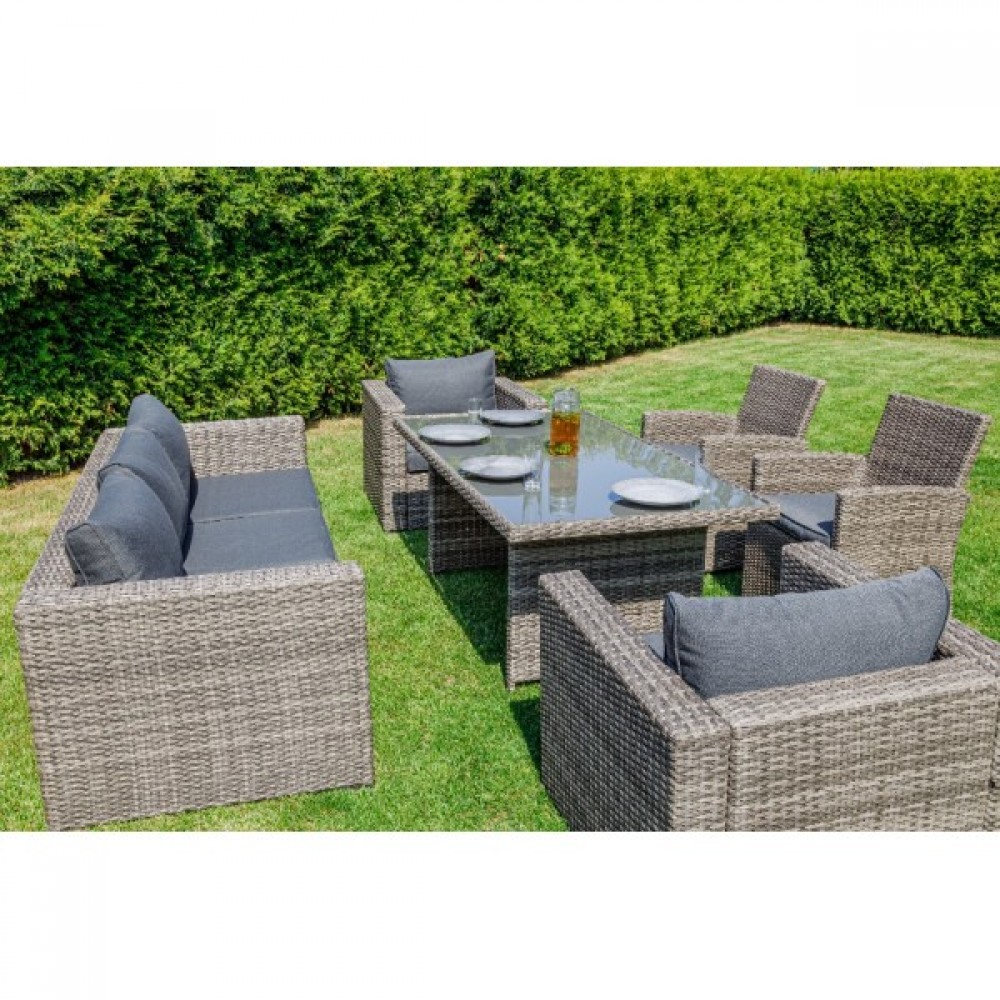 Комплект мебели KARL с обеденным столом в сером цвете — это элегантное и удобное решение для вашей столовой или гостиной. Он состоит из трехместного дивана, двух кресел и обеденного стола, изготовленных из искусственного ротанга на металлическом каркасе.