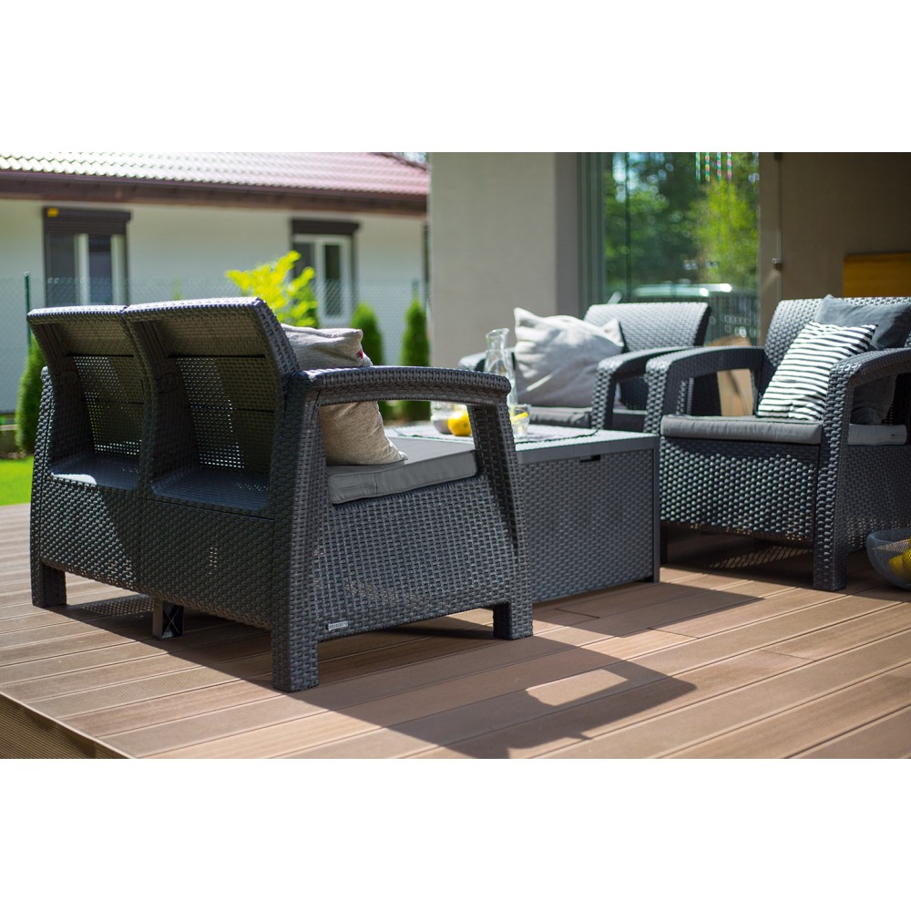 Corfu box - это очередное предложение линии Корфу. Это элегантный мебельный гарнитур с фактурой, напоминающей ротанг, которая состоит из двух кресел, диван-кровати и столиком-сундуком. Продукт снабжен мягкими подушками стильных цветов. Мебель с легкой и одновременно устойчивой конструкцией красиво впишется в любое приусадебное пространство, такое как сад или терраса. Набор очень легко чистится. Изготовлен из стойкой к воздействию УФ-излучения и погодных условий пластмассы. Преимущества: Эргономичный дизайн Сделано из прочного пластика Неметаллическая рама - не ржавеет и не гниет Простая сборка без инструмента Благодаря стойкому к высоким температурам полипропилену, цвета не выгорают и не бледнеют Легко мыть и удобно хранить