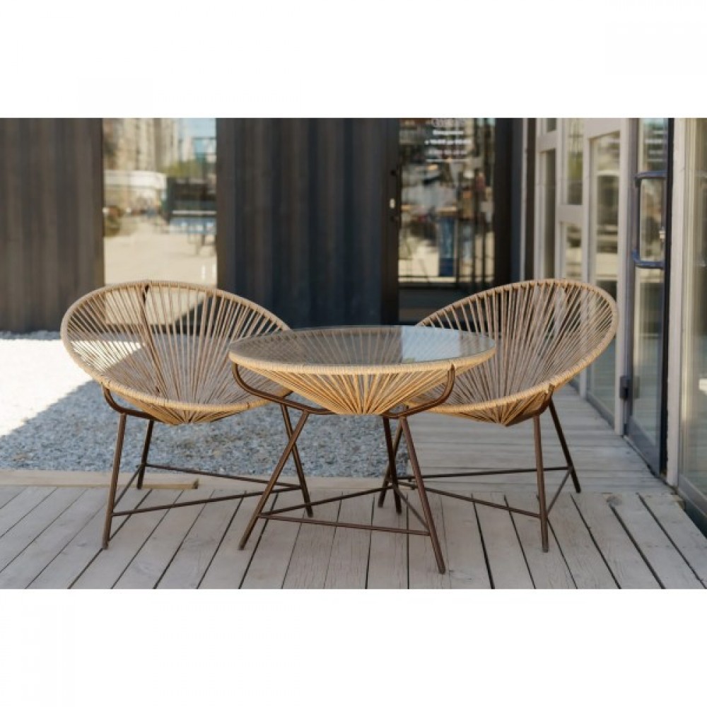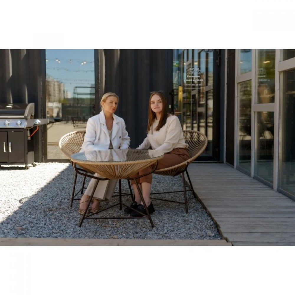 Комплект плетеной мебели из двух стульев и стола со столешницей из закаленного стекла.