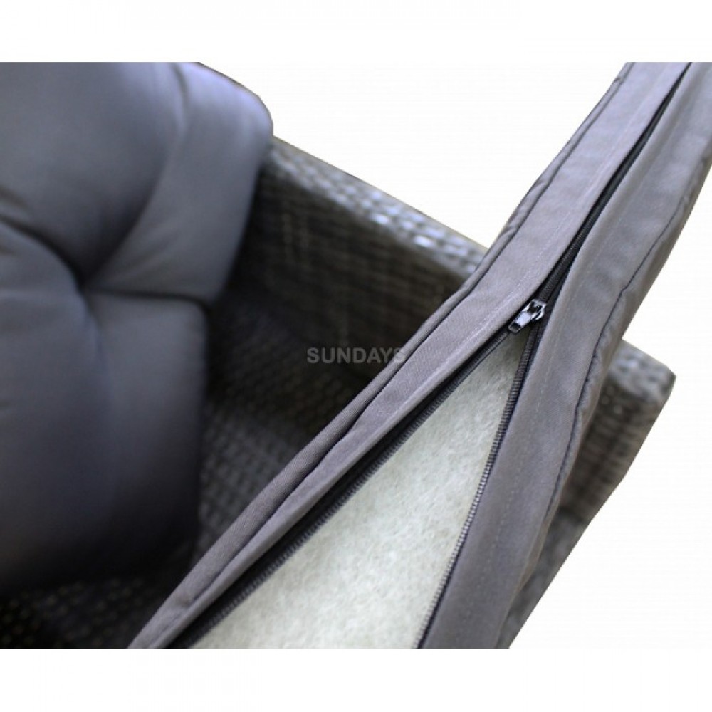 В комплект входят два комфортных кресла, трехместный диван диван, два пуфика и обеденный столик. Мягкие подушки из водоотталкивающего материала обеспечат дополнительный комфорт во время отдыха. Чехлы на молнии позволят легко ухаживать за мебелью Удобные спинки и подлокотники позволят расслабиться и насладиться природой.