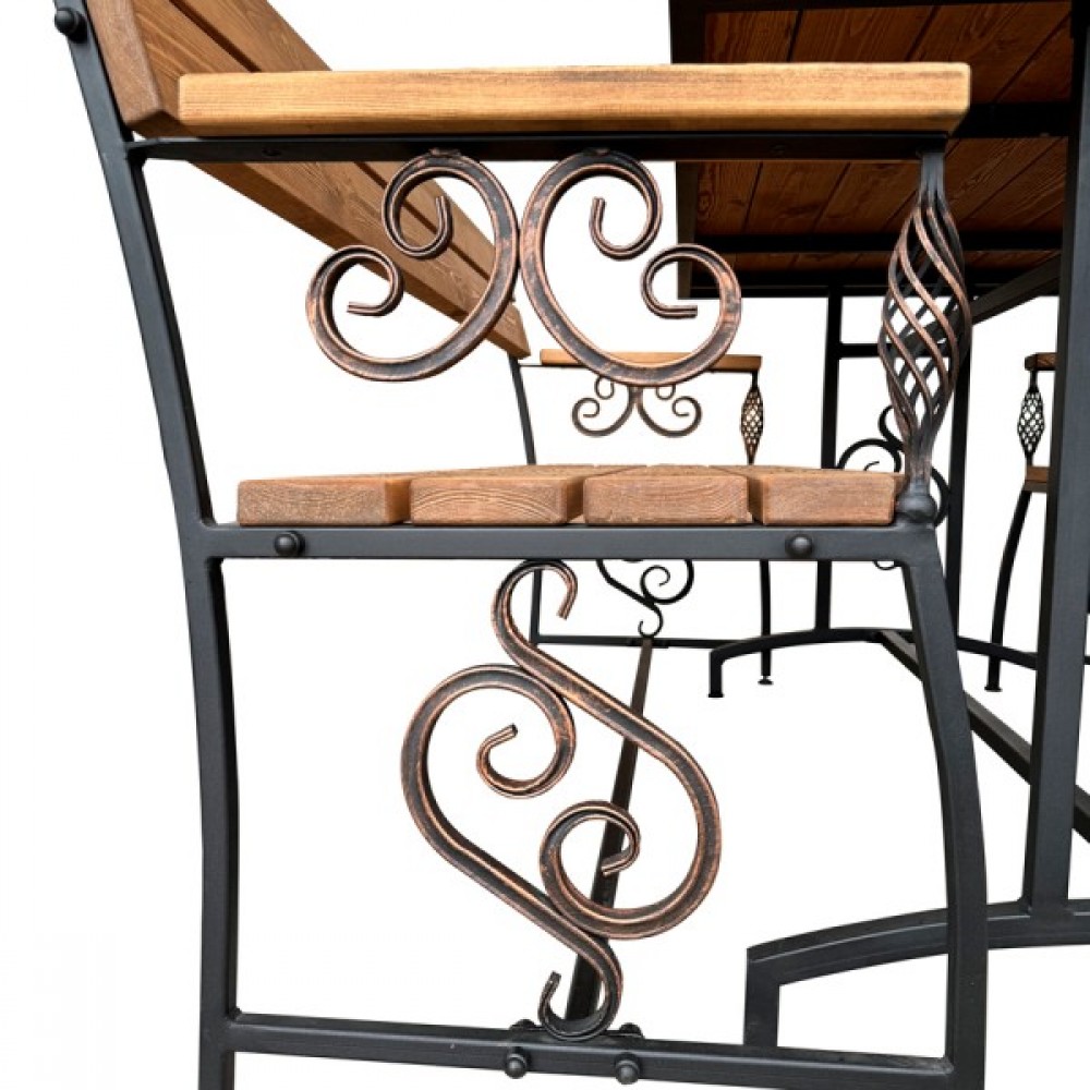 Компактный, кованый комплект МФ-6 станет прекрасным дополнением экстерьера или интерьера различных архитектурных стилей, будет идеально удобен как на садовом участке, так и в уличных кафе и ресторанах.