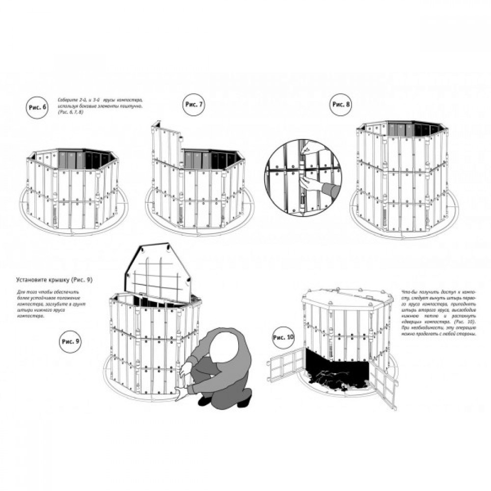 Компостер легко собирается и надежно крепится к земле специальными пластиковыми штырями.