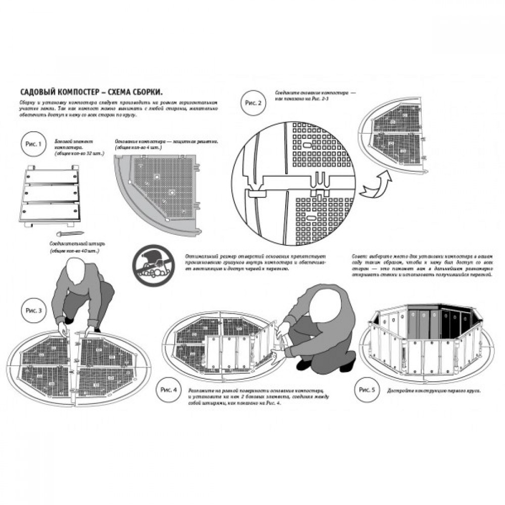 Компостер легко собирается и надежно крепится к земле специальными пластиковыми штырями.