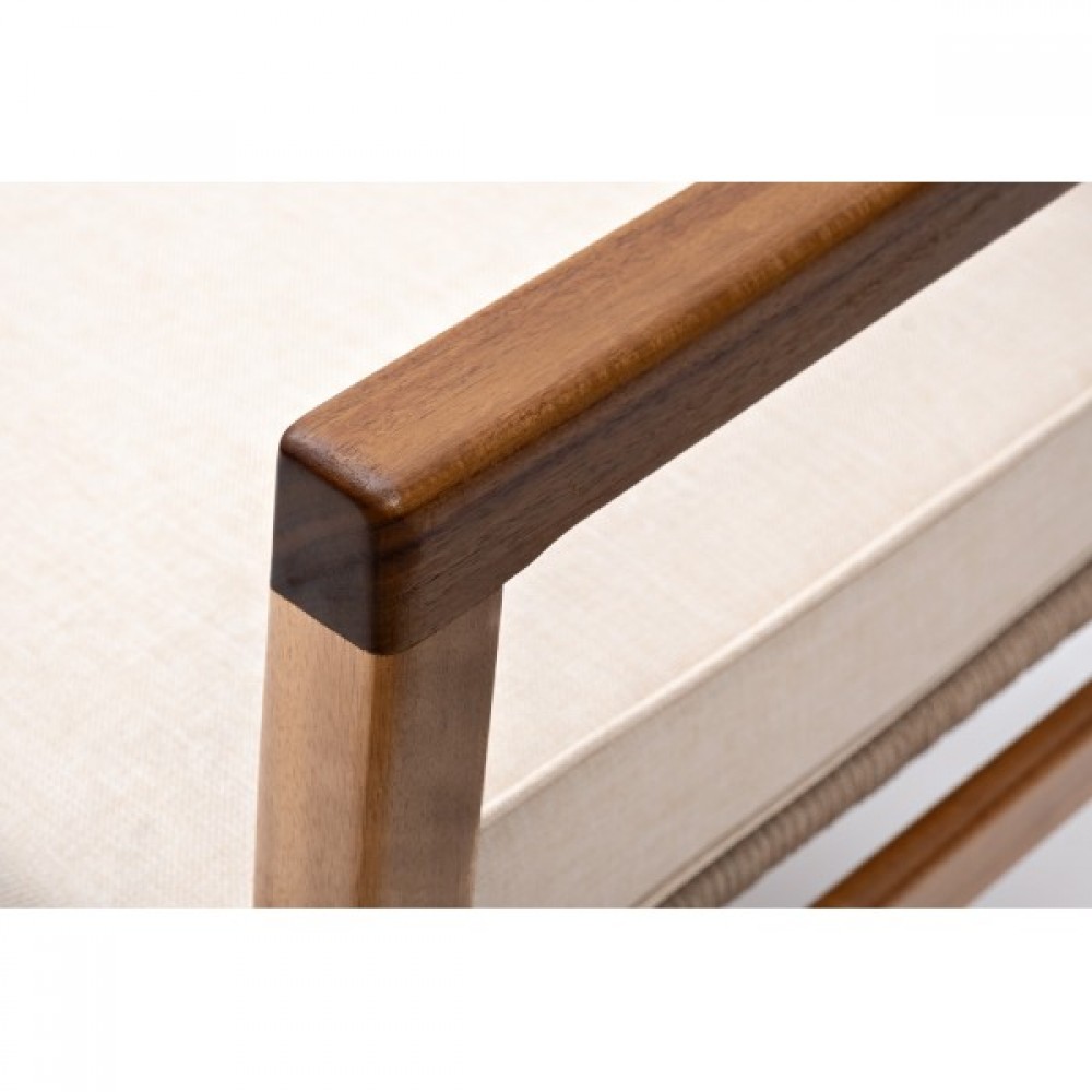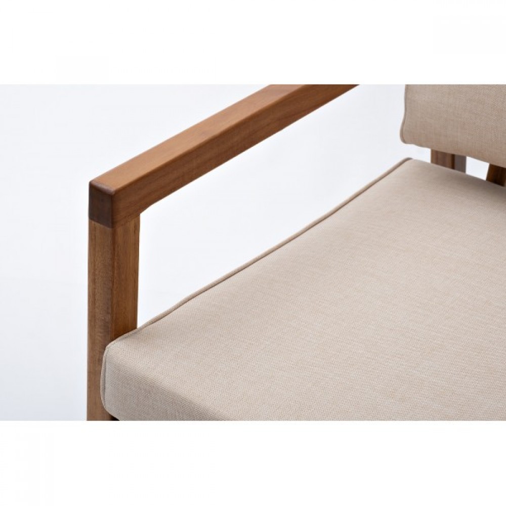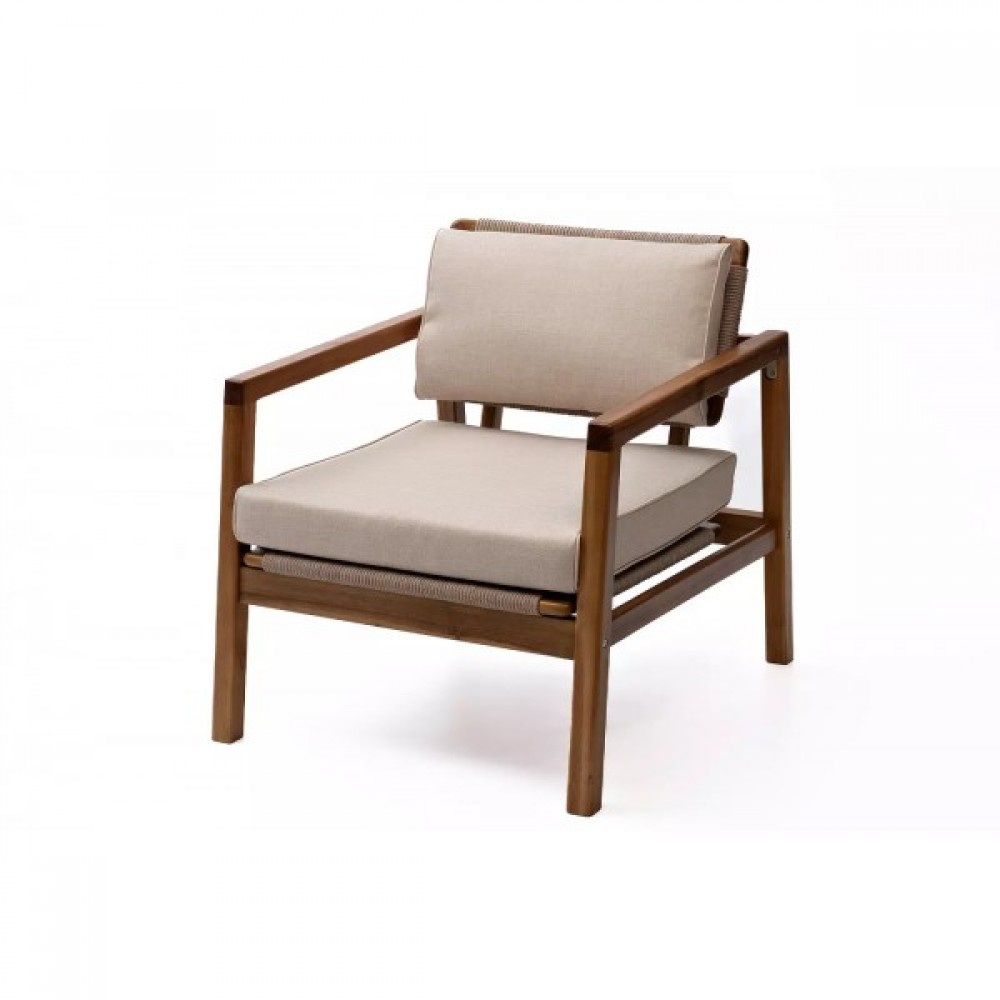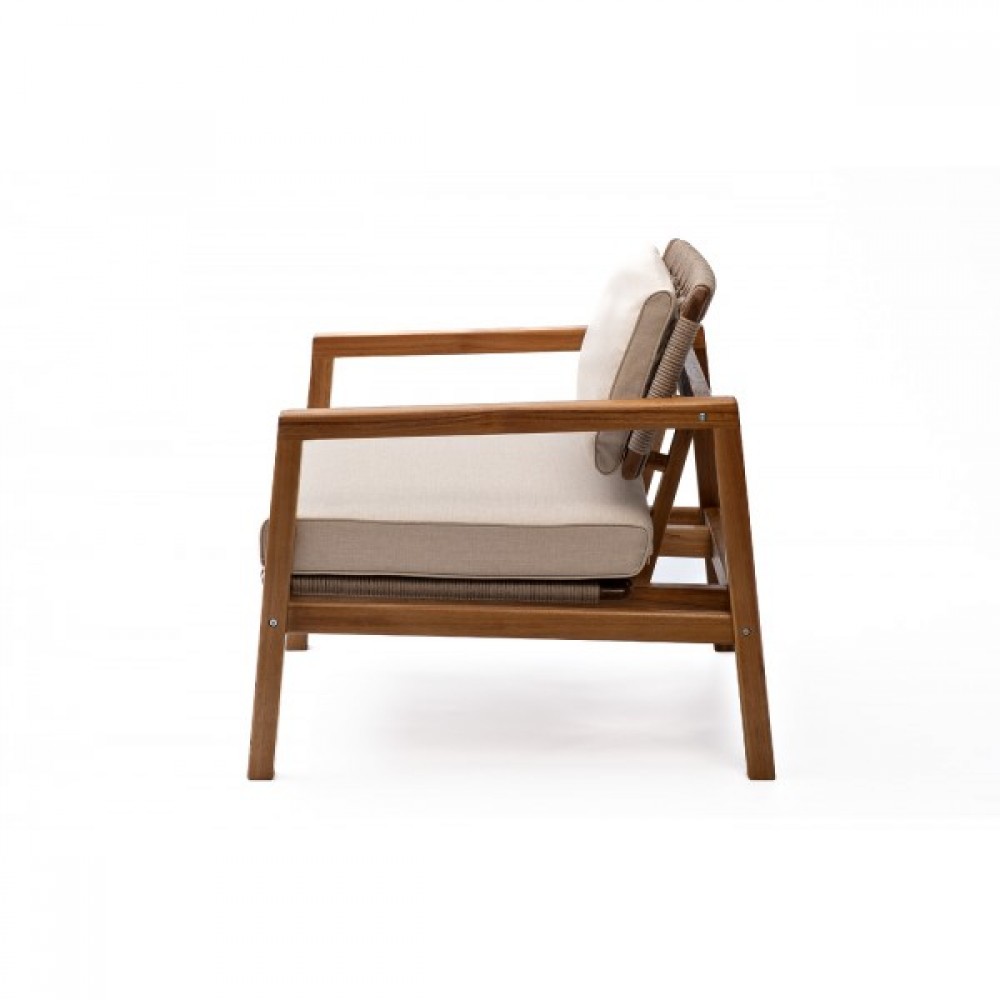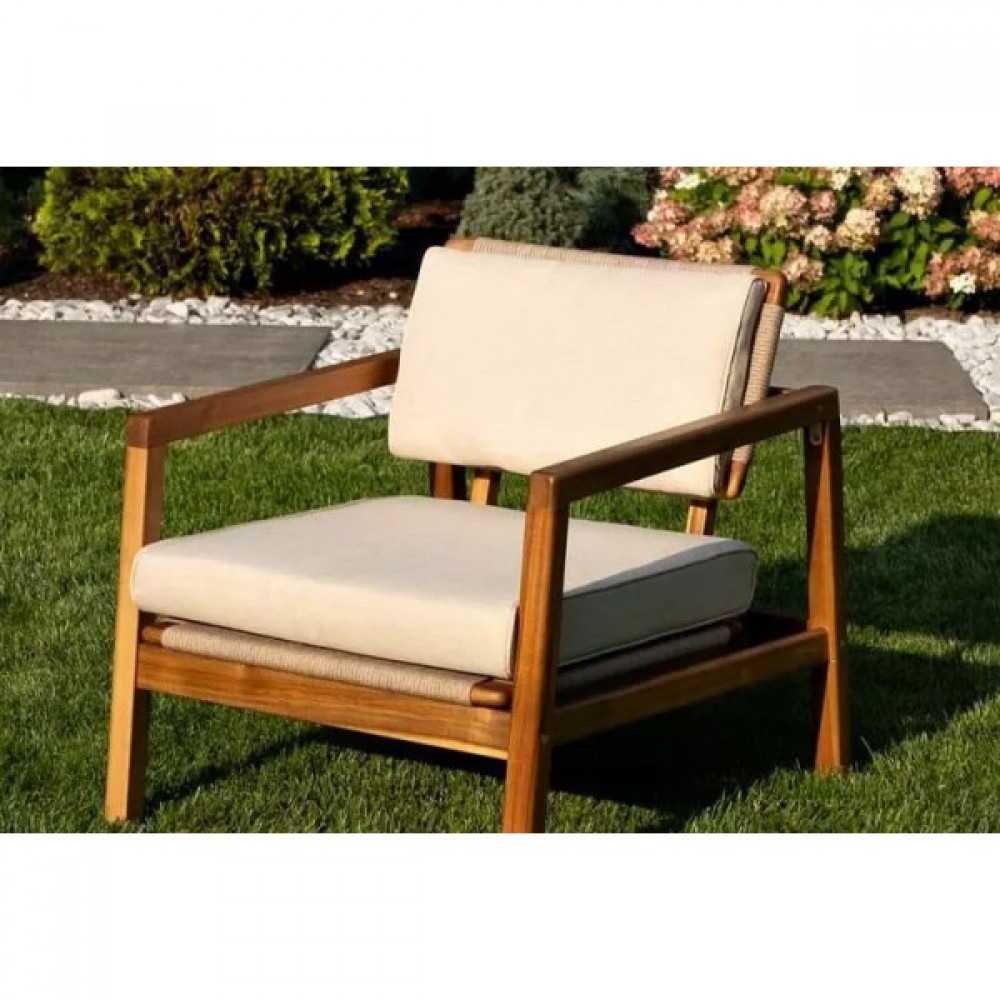 CALISTO – современная коллекция садовой мебели из акации, выполненная в комбинации натурального веревочного плетения rope, массива акации и бежевых подушек.