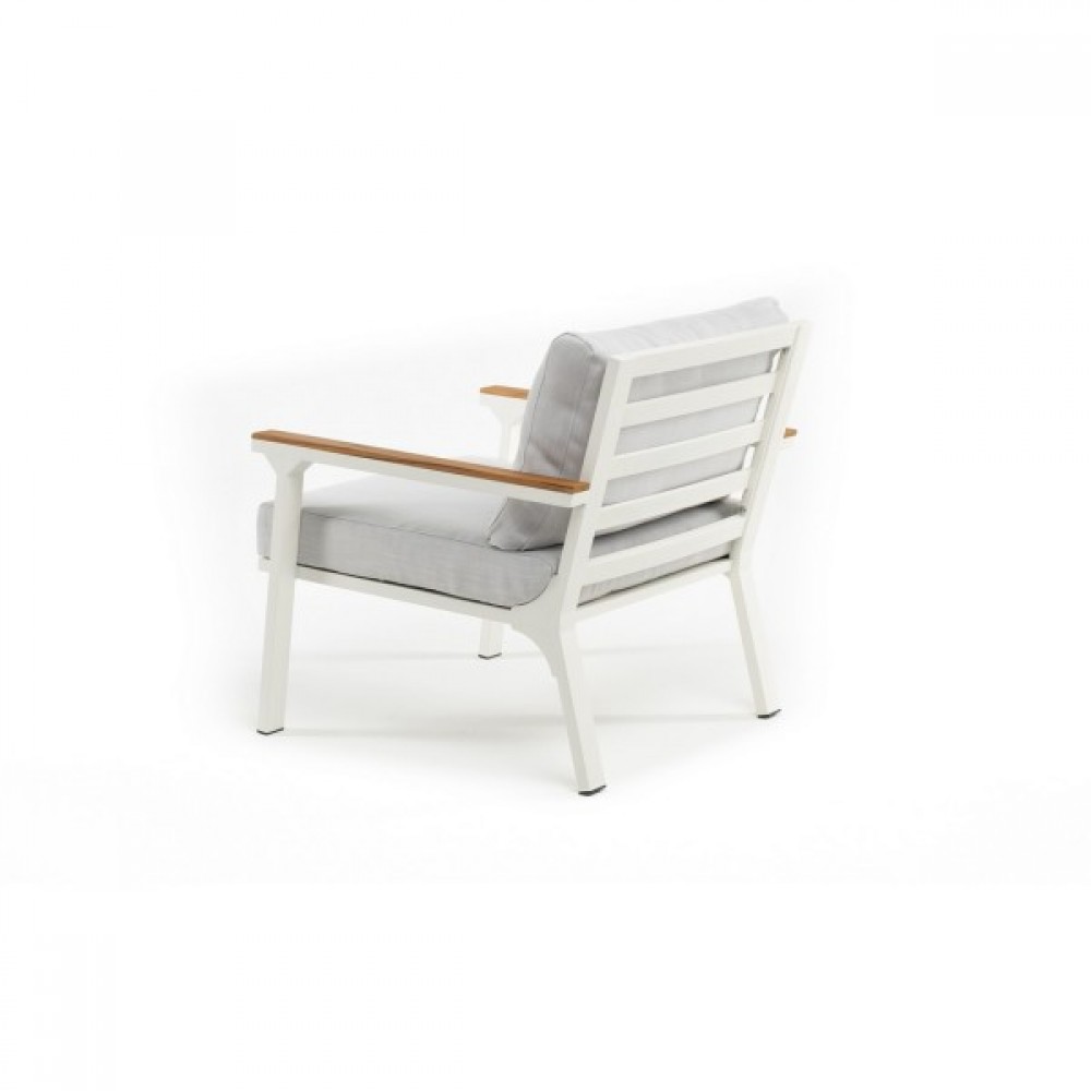 Каркас из алюминия с порошковым покрытием в белом матовом цвете обеспечивает защиту от коррозии, а элементы из массива тика, обработанные натуральным маслом, добавляют естественного тепла. Подушки в комплекте выполнены из водонепроницаемой ткани Olefin, цвет подушек светло-серый.