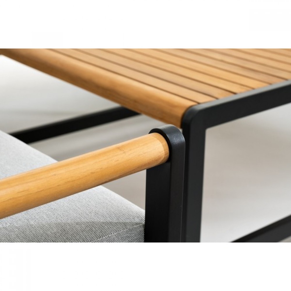 Дополняют конструкцию элементы из массива тика. Мягкие элементы мебели выполнены из водоотталкивающей ткани Olefin.