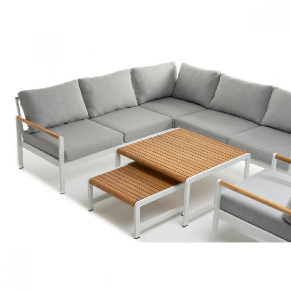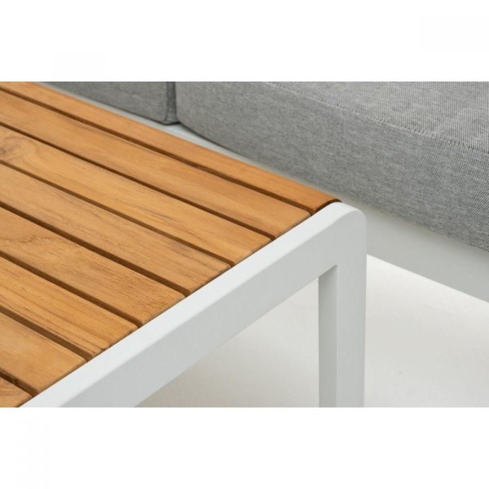 Дополняют конструкцию элементы из массива тика. Мягкие элементы мебели выполнены из водоотталкивающей ткани Olefin.