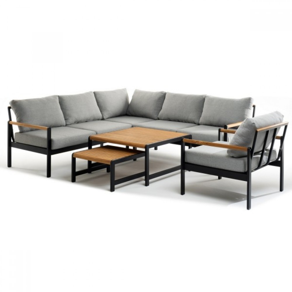 Дополняют конструкцию элементы из массива тика. Мягкие элементы мебели выполнены из водоотталкивающей ткани Olefin.