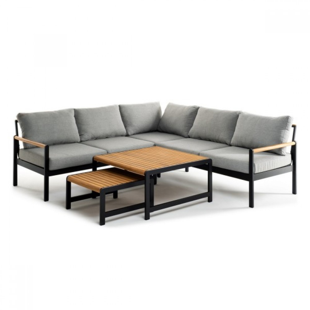 Дополняют конструкцию элементы из массива тика. Мягкие элементы мебели выполнены из водоотталкивающей ткани Olefin.