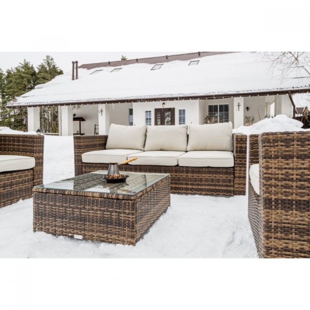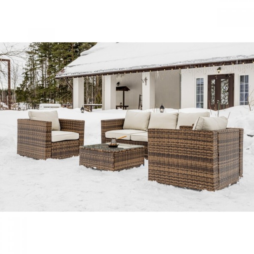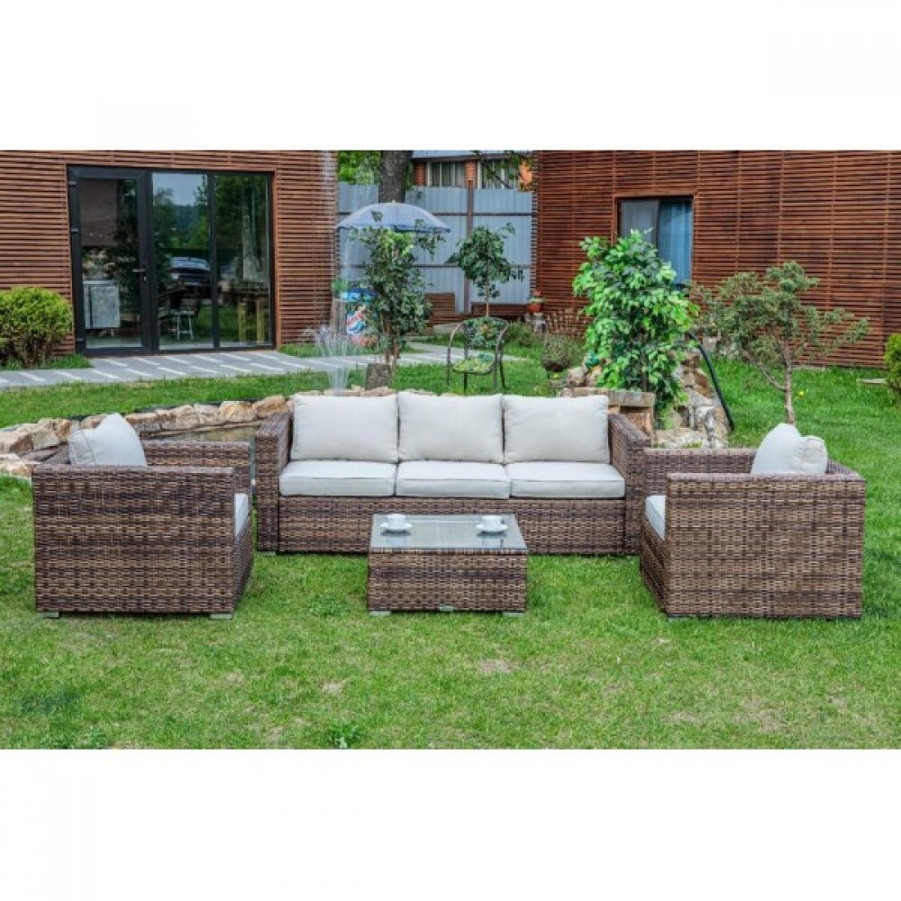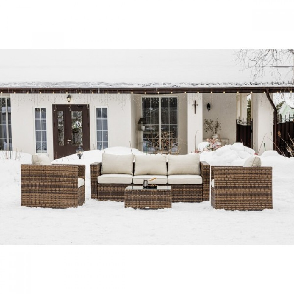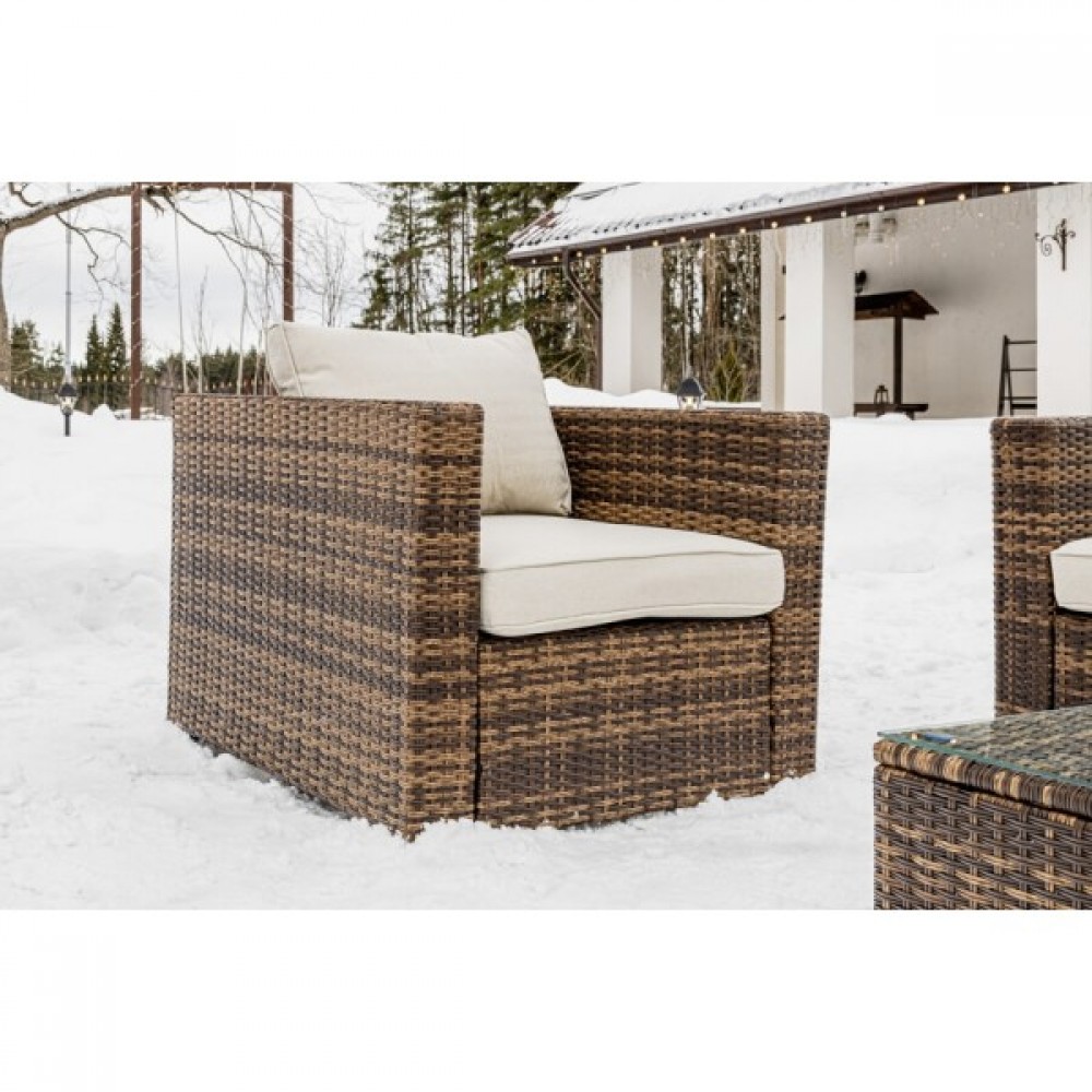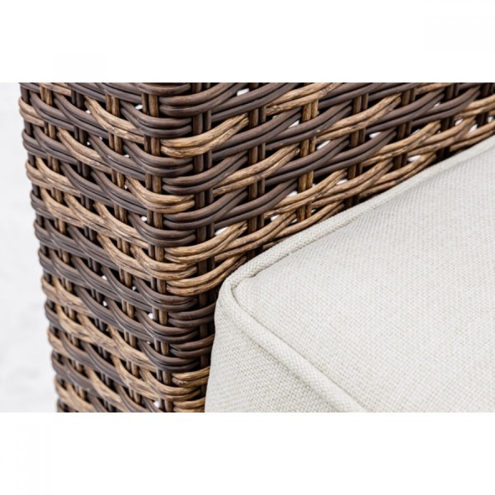 Лаунж-зона KARL коричневого цвета выполнена в универсальном стиле, который идеально впишется как на открытой террасе, так и под навесом или в саду. Комбинация элегантного плоского плетения коричневого оттенка и бежевых подушек – достойный центр вашей загородной жизни!