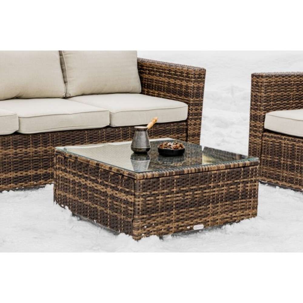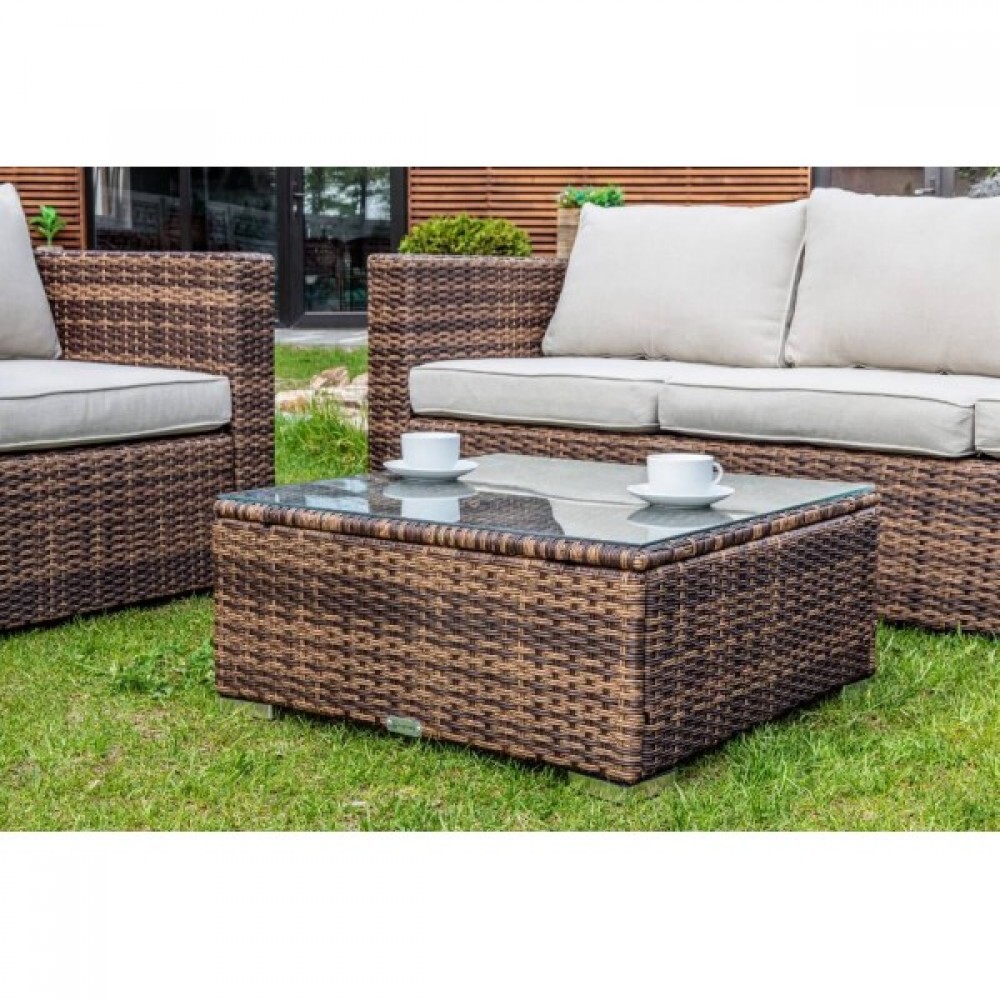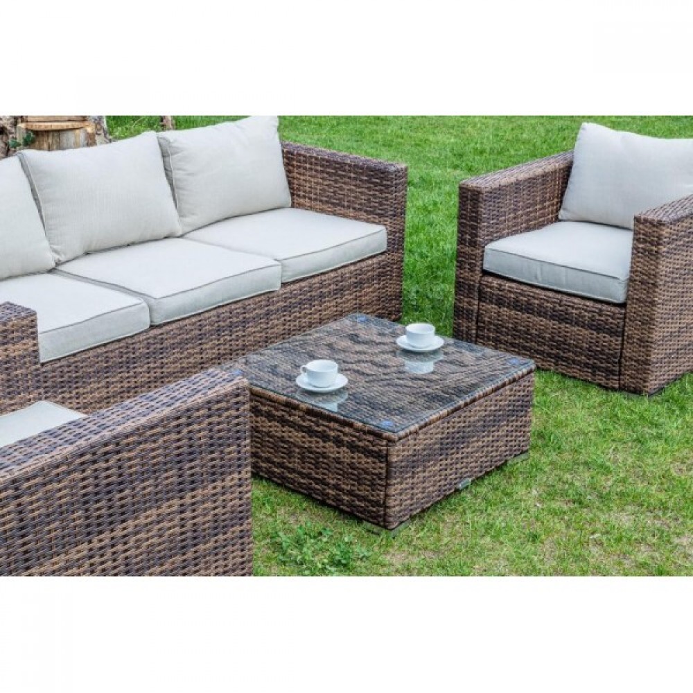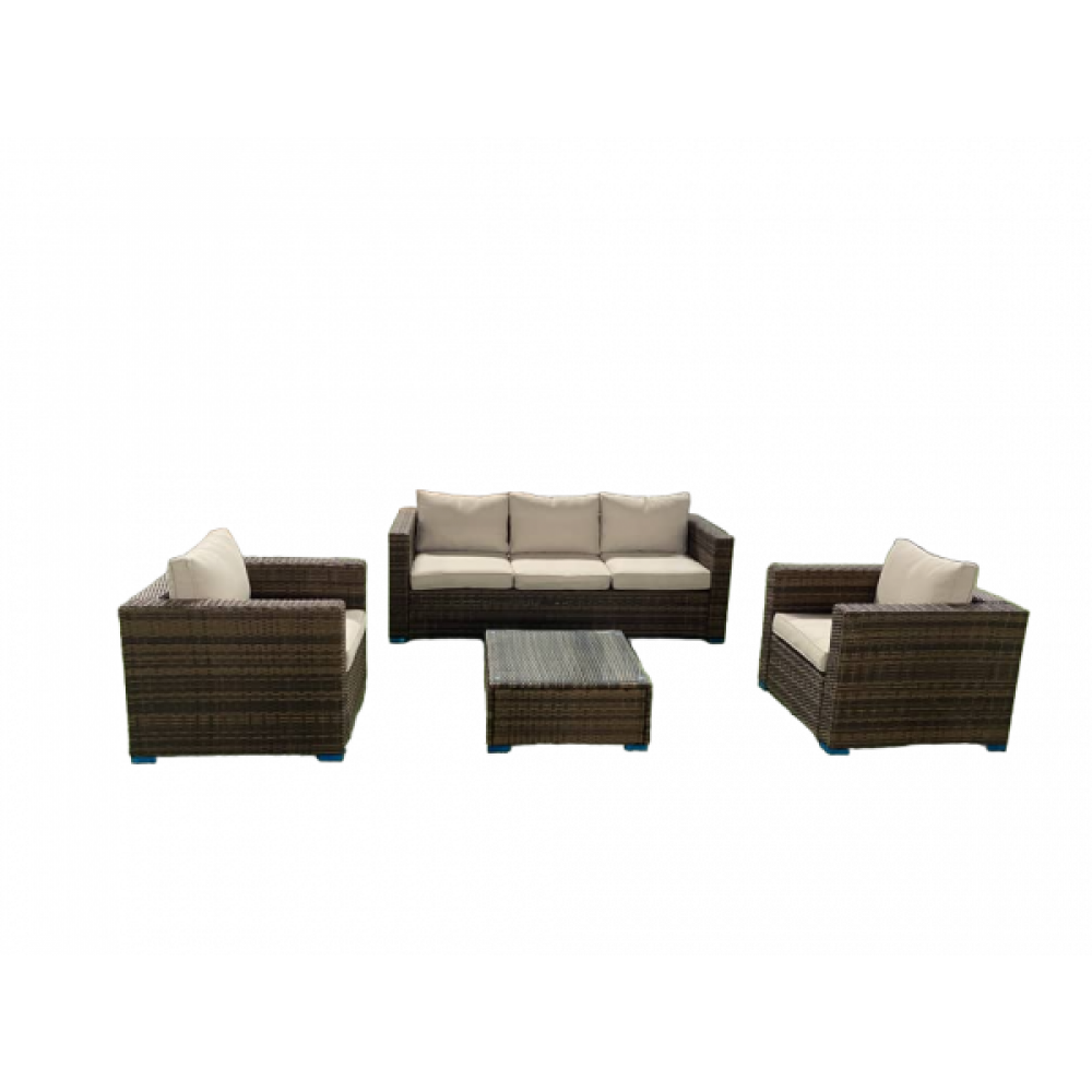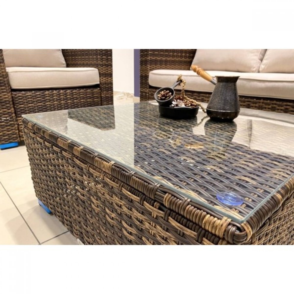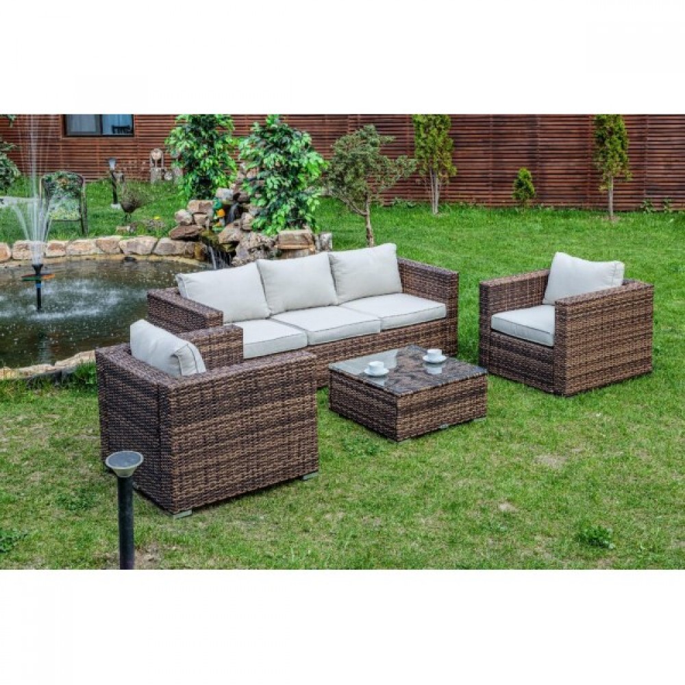 Лаунж-зона KARL коричневого цвета выполнена в универсальном стиле, который идеально впишется как на открытой террасе, так и под навесом или в саду. Комбинация элегантного плоского плетения коричневого оттенка и бежевых подушек – достойный центр вашей загородной жизни!