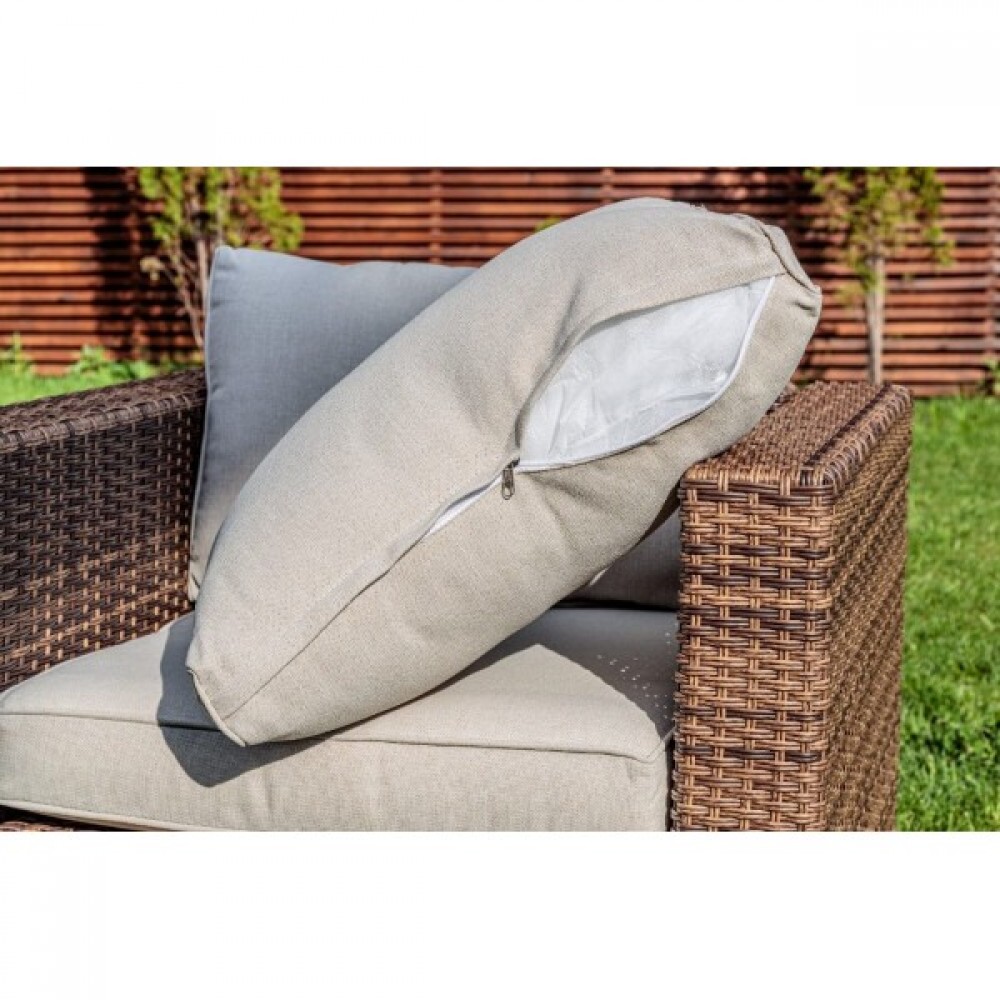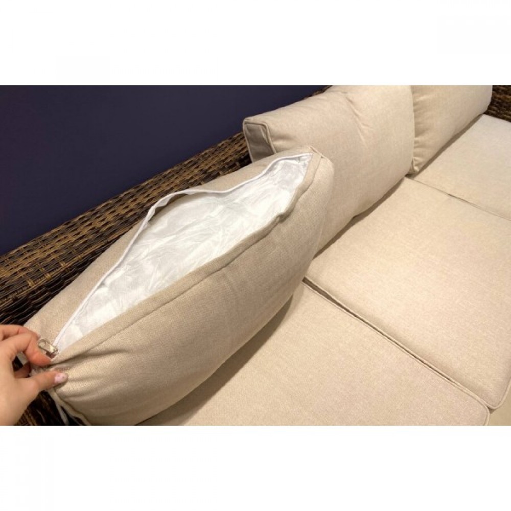 Комплект для зоны отдыха дополнен мягкими подушками со съемными чехлами из водоотталкивающей ткани. Поэтому совсем не обязательно убирать их на время дождя!