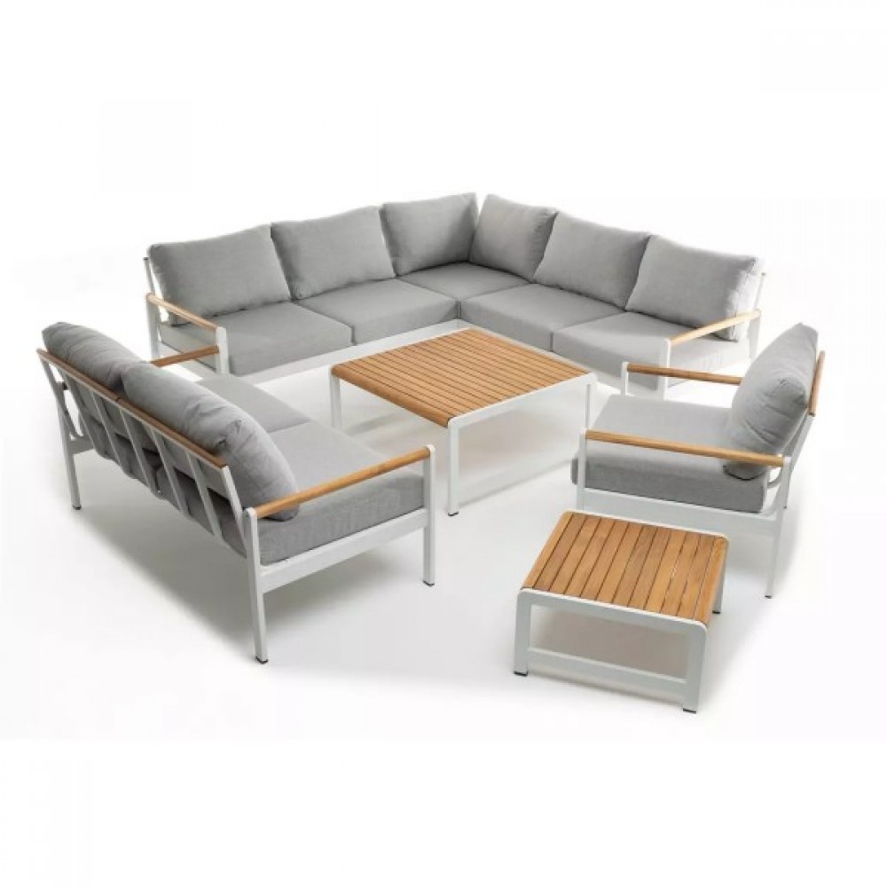Дополняют конструкцию элементы из массива тика. Мягкие элементы мебели выполнены из водоотталкивающей ткани Olefin.