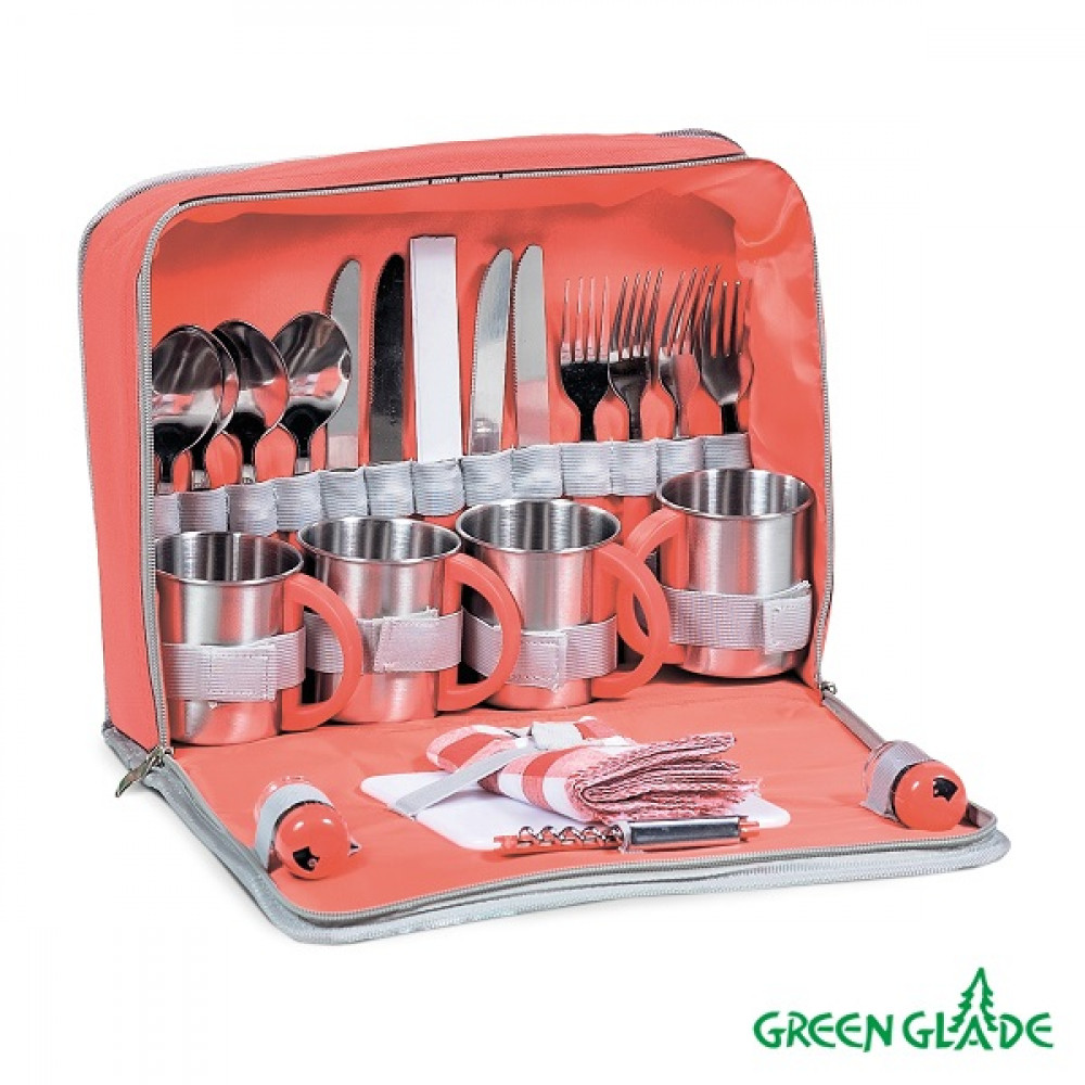 Набор для пикника Green Glade содержит всю необходимую посуду для пикника и комфортного отдыха на природе. В набор входит: - нож (4 шт), - вилка (4 шт), - ложка (4 шт), - чашка (4 шт), - салфетка (4 шт), - солонка, - перечница, - нож для сыра/масла, - складной нож со штопором, - пластиковая разделочная доска. Столовые приборы и кружки изготовлены из полированной нержавеющей стали с пластиковыми ручками красного цвета. Салфетки выполнены из хлопка с принтом в клетку. Квадратная разделочная доска сделана из прочного пластика белого цвета, солонка и перечница - из прозрачного пластика. Все приборы компактно помещаются в специальную сумку из полиэстера, сумка закрывается на застежку-молнию; оснащена двумя удобными ручками для переноски и двумя вшитыми кармашка на молнии для хранения аксессуаров. Длина вилки/ложки: 18,5 см. Длина ножа: 21 см. Диаметр кружки (по верхнему краю): 7,5 см. Высота кружки: 8 см. Размер разделочной доски: 15 см х 15 см. Размер салфетки: 31 см х 31 см. Размер солонки/перечницы: 3 см х 3 см х 5,5 см. Длина ножа со штопором: 11 см. Размер сумки: 32 см х 26 см х 11 см." />