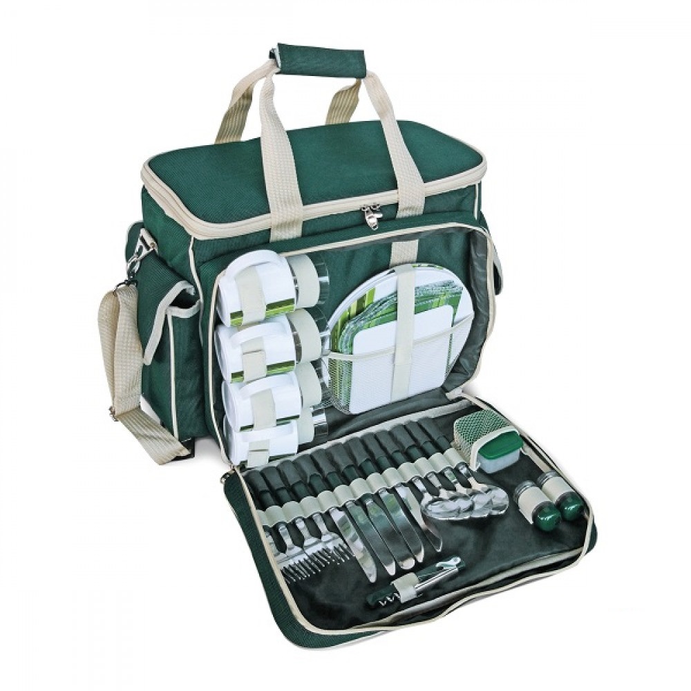 Набор для пикника Green Glade рассчитан на 4 персоны. Предметы набора хранятся во вместительном отделении удобной сумки с регулируемой лямкой и ручками. У сумки одно большое отделение с термоизоляционным слоем. Также имеются три вместительных кармашка. Все предметы набора надежно фиксируются внутри сумки специальными эластичными фиксаторами. В набор входит: - изотермическая сумка-холодильник: 1 шт, объем: 30 л, размер 48 см х 36 см х 33 см, - ножи: 4 шт, длина 20,5 см, - вилки: 4 шт, длина 19 см, - ложки: 4 шт, длина 19 см, - стаканы пластиковые: 4 шт, объем: 250 мл, - чашки пластиковые: 4 шт, объем: 250 мл, - тарелки пластиковые: 4 шт, диаметр 22,5 см, - салфетки хлопковые: 4 шт, - солонка: 1 шт, - перечница: 1 шт, - складной нож со штопором и открывалкой: 1 шт, длина 16,5 см, - нож для сыра/масла: 1 шт, длина 19 см, - емкость для сыра/масла: 1 шт, размер 7,5 см х 6 см х 3,5 см, - пластиковая разделочная доска: 1 шт, размер 15 см х 15 см х 0,5 см. Набор для пикника Green Glade обеспечит полноценный отдых на природе для большой компании или семьи. Сумка холодильник поможет сохранить свежесть ваших продуктов до 12 часов (при использовании аккумулятора холода)." />