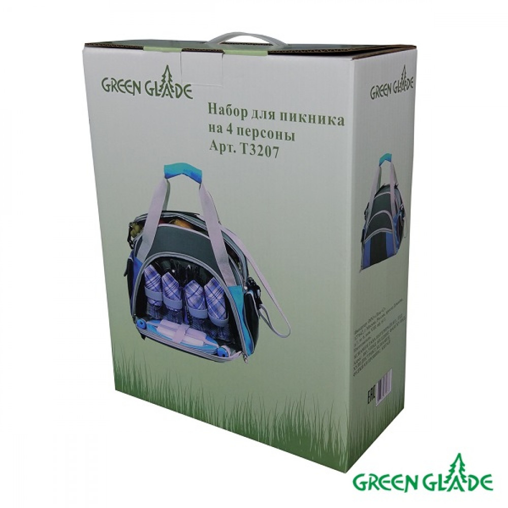 Набор для пикника Green Glade рассчитан на 4 персоны. Предметы набора хранятся во вместительном отделении удобной сумки с регулируемой лямкой и ручками. У сумки одно большое отделение с термоизоляционным слоем. Также имеются два кармашка по бокам, закрывающиеся на липучку, и один кармашек спереди. Все отделения закрываются на застежки-молнии. Все предметы набора надежно фиксируются внутри сумки специальными эластичными фиксаторами. В набор входит: - изотермическая сумка-холодильник: 1 шт, объем: 10 л, размер 40 см х 37 см х 17 см, - ножи: 4 шт, длина 20,5 см, - вилки: 4 шт, длина 19 см, - ложки: 4 шт, длина 19 см, - бокалы пластиковые: 4 шт, объем: 200 мл, - тарелки пластиковые: 4 шт, диаметр 22,5 см, - салфетки хлопковые: 4 шт, - солонка: 1 шт, - перечница: 1 шт, - складной нож со штопором и открывалкой: 1 шт, длина 16,5 см, - нож для сыра/масла: 1 шт, длина 19 см, - пластиковая разделочная доска: 1 шт, размер 15 см х 15 см х 0,5 см. Набор для пикника Green Glade обеспечит полноценный отдых на природе для большой компании или семьи. Сумка холодильник поможет сохранить свежесть ваших продуктов до 12 часов (при использовании аккумулятора холода)." />