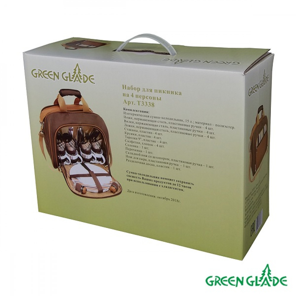 Набор для пикника Green Glade рассчитан на 4 персоны. Предметы набора хранятся во вместительном отделении удобной сумки с регулируемой лямкой и ручками. У сумки одно большое отделение с термоизоляционным слоем. Все отделения закрываются на застежки-молнии. ВВсе предметы набора надежно фиксируются внутри сумки специальными эластичными фиксаторами. В набор входит: - изотермическая сумка-холодильник: 1 шт, объем: 15 л, размер 38 см х 29 см х 20 см, - ножи: 4 шт, длина 20,5 см, - вилки: 4 шт, длина 19 см, - ложки: 4 шт, длина 19 см, - бокалы пластиковые: 4 шт, объем: 250 мл, - чашки пластиковые: 4 шт, объем: 250 мл, - тарелки пластиковые: 4 шт, диаметр 22 см, - салфетки хлопковые: 4 шт, - солонка: 1 шт, - перечница: 1 шт, - складной нож со штопором и открывалкой: 1 шт, длина 16,5 см, - нож для сыра/масла: 1 шт, длина 19 см, - пластиковая разделочная доска: 1 шт, размер 15 см х 15 см х 0,5 см. Набор для пикника Green Glade обеспечит полноценный отдых на природе для большой компании или семьи. Сумка холодильник поможет сохранить свежесть ваших продуктов до 12 часов (при использовании аккумулятора холода)." />