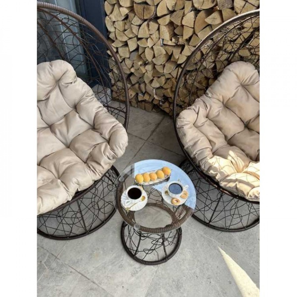 В садовый комплект входит: два кресла, две подушки и журнальный столик.