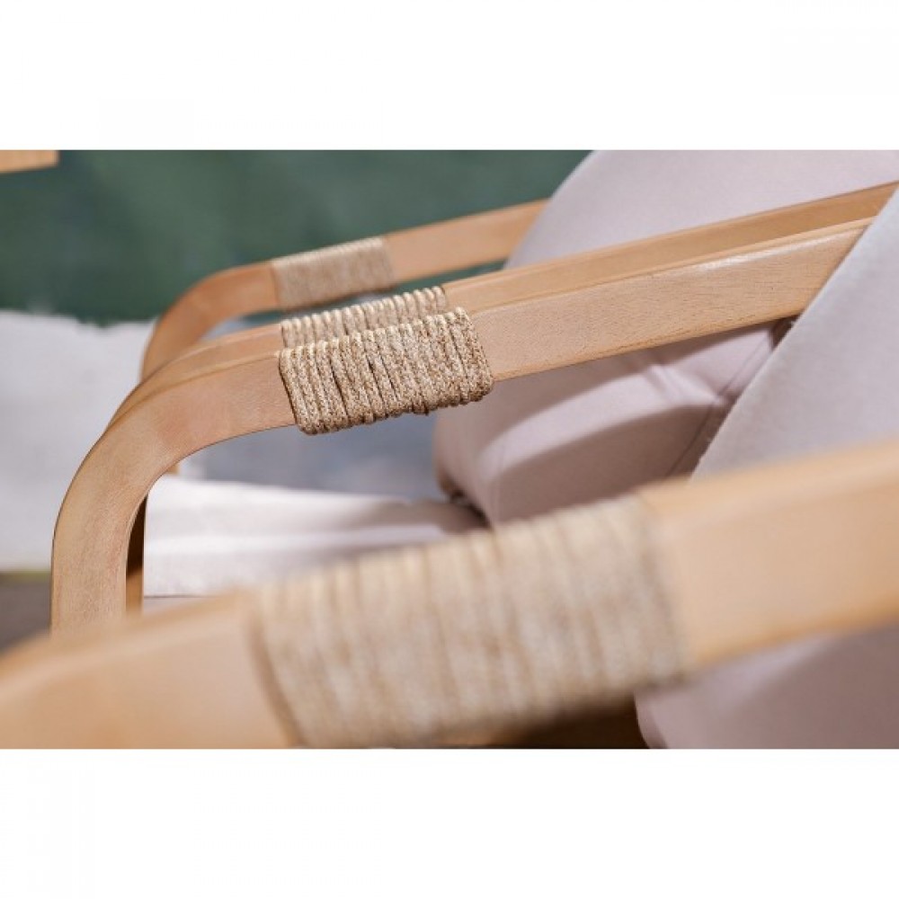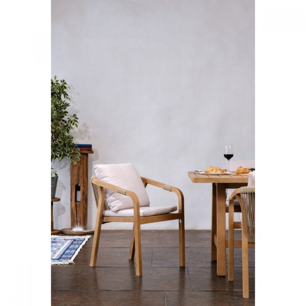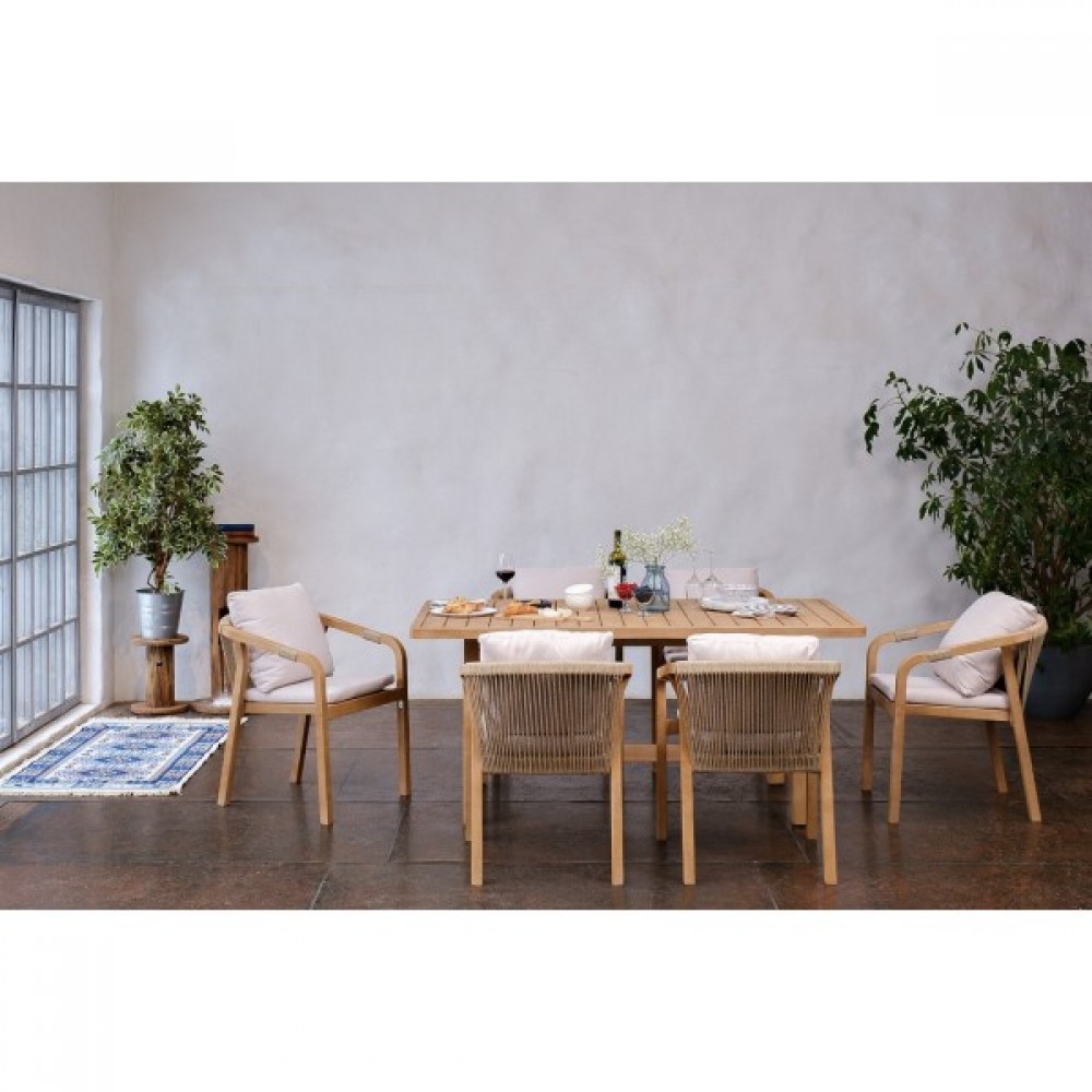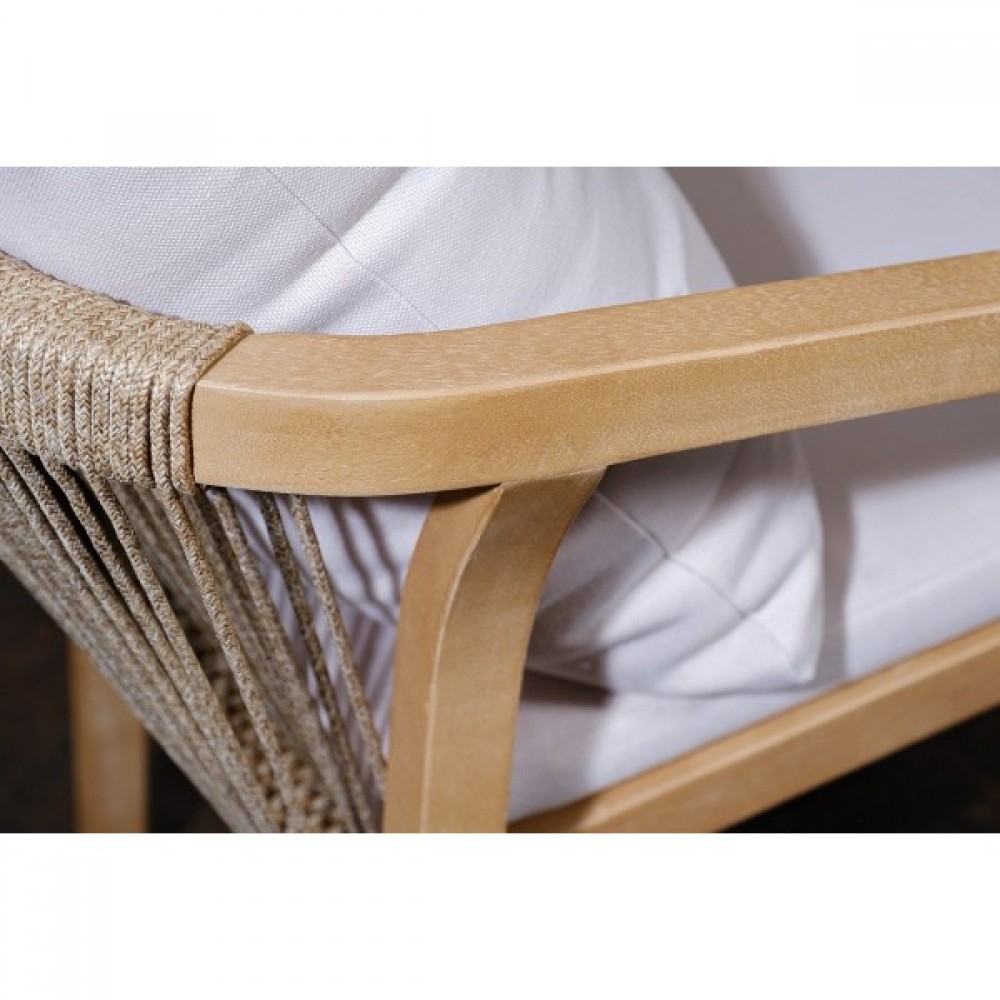 RIMINI – современная коллекция садовой мебели из акации, выполненная в комбинации натурального веревочного плетения rope, массива акации и бежевых подушек.