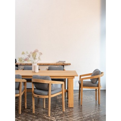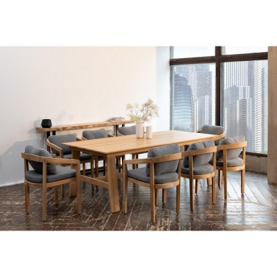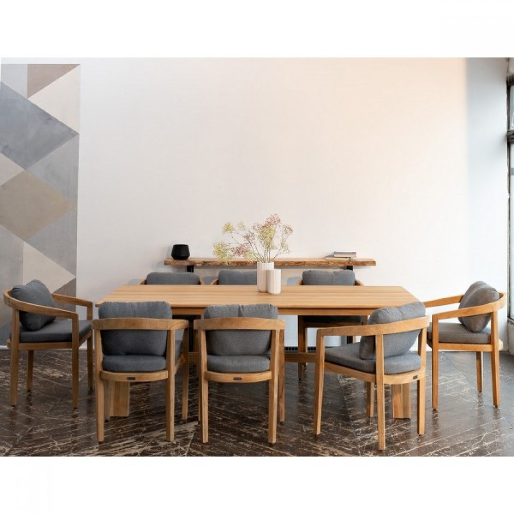 Эффектное сочетание натуральной фактуры массива тика и стильных светло-серых подушек у обеденных кресел.