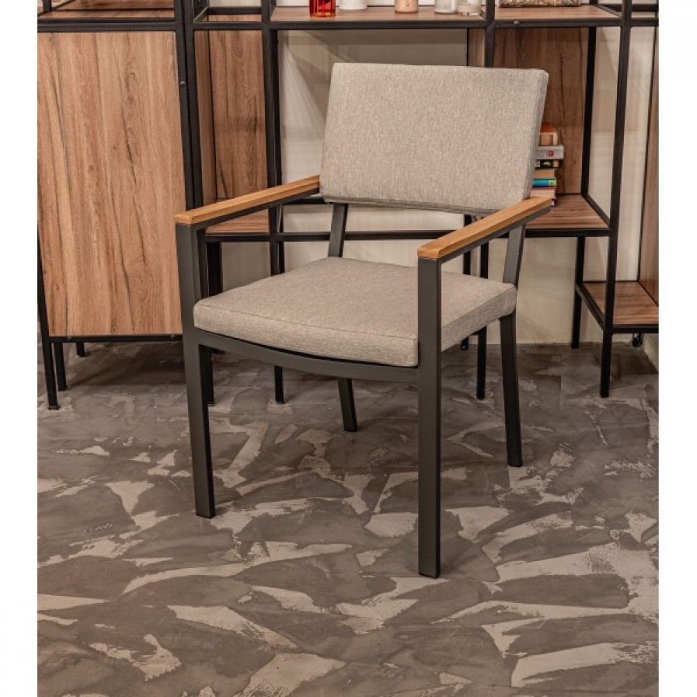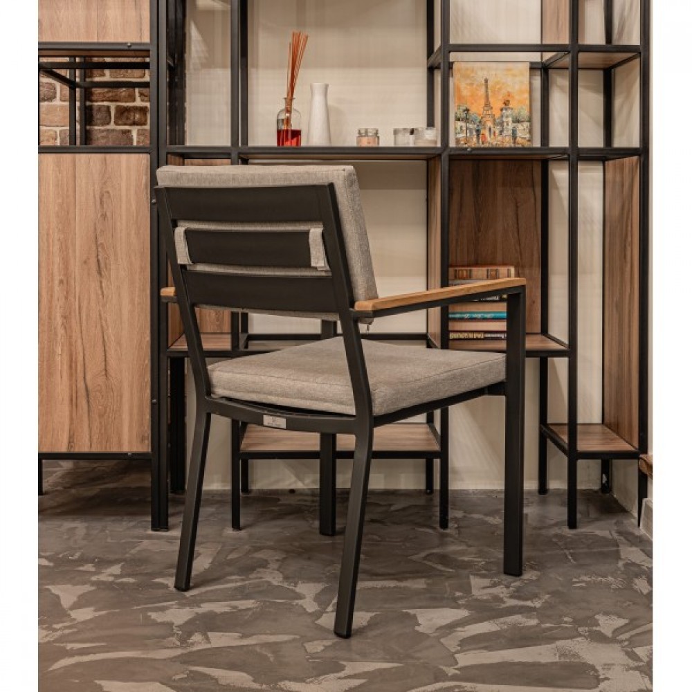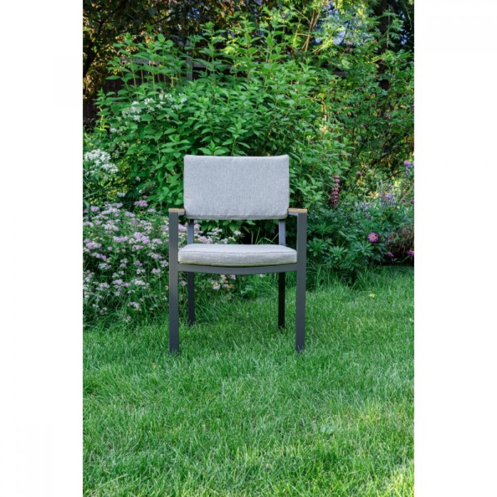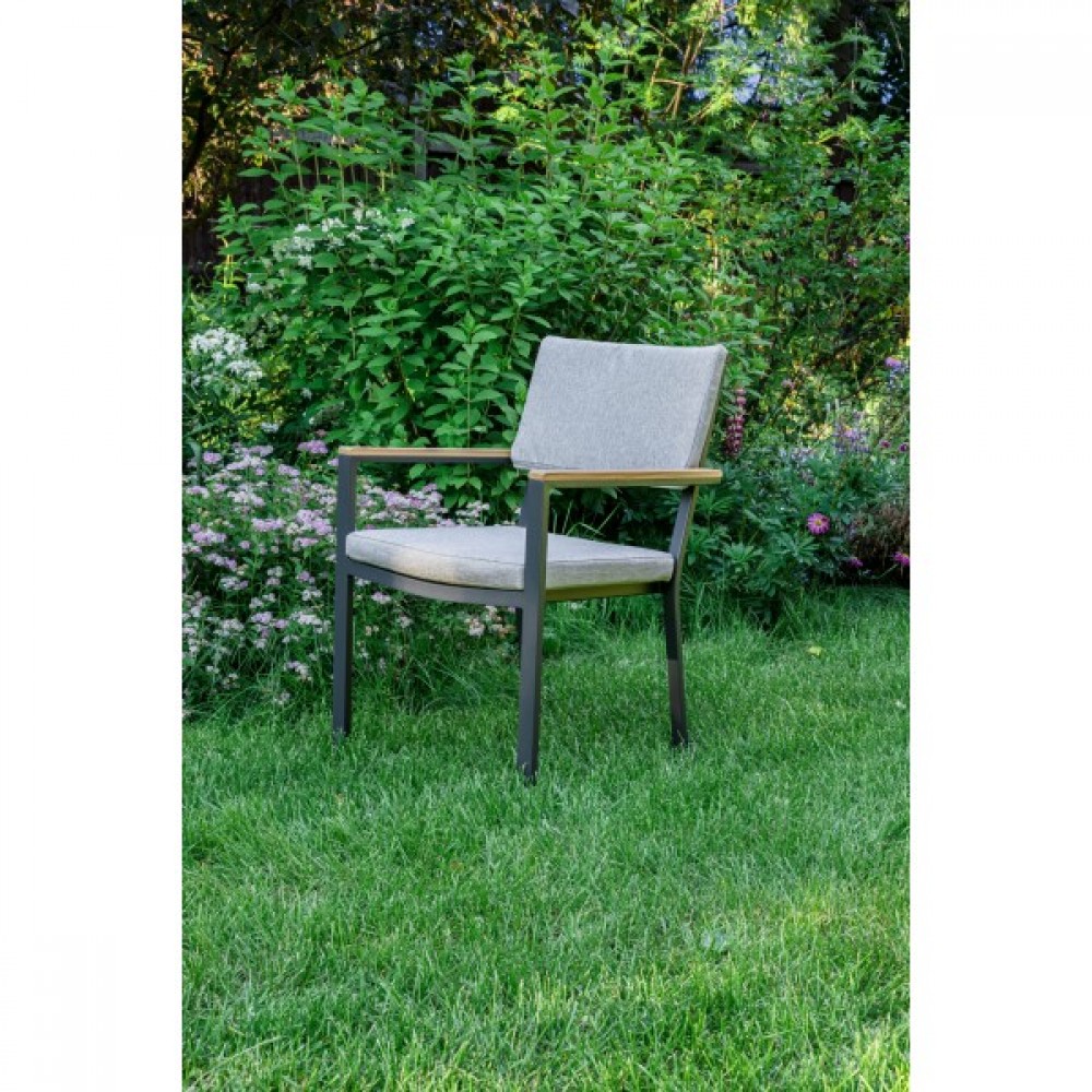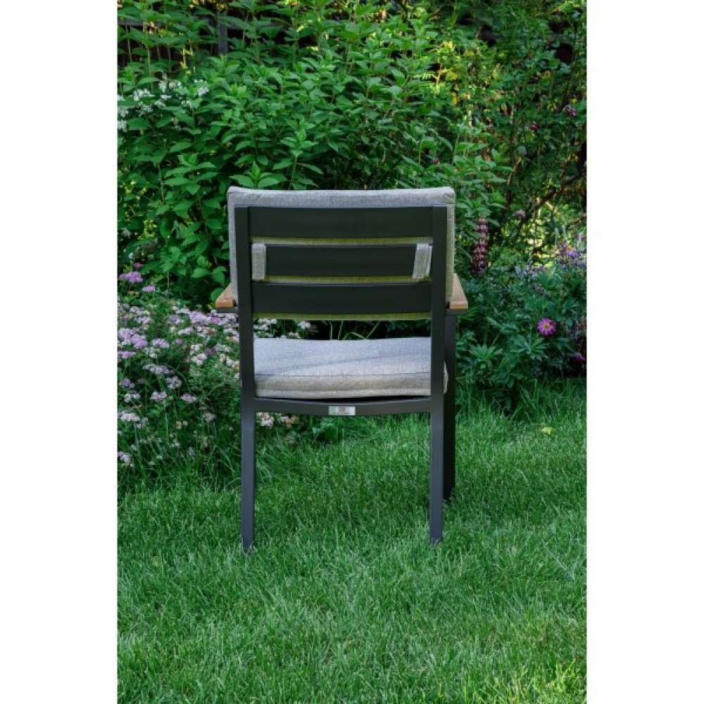 Основой кресла является алюминиевый каркас, который обеспечивает надежность и прочность конструкции. Подлокотники из натурального тика не только добавляют креслу изысканный вид, но и обеспечивают комфортную поддержку рук во время еды или отдыха.