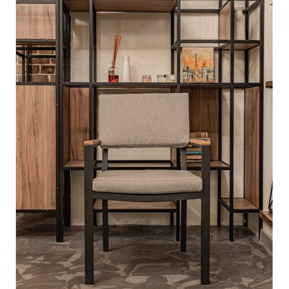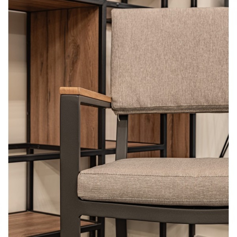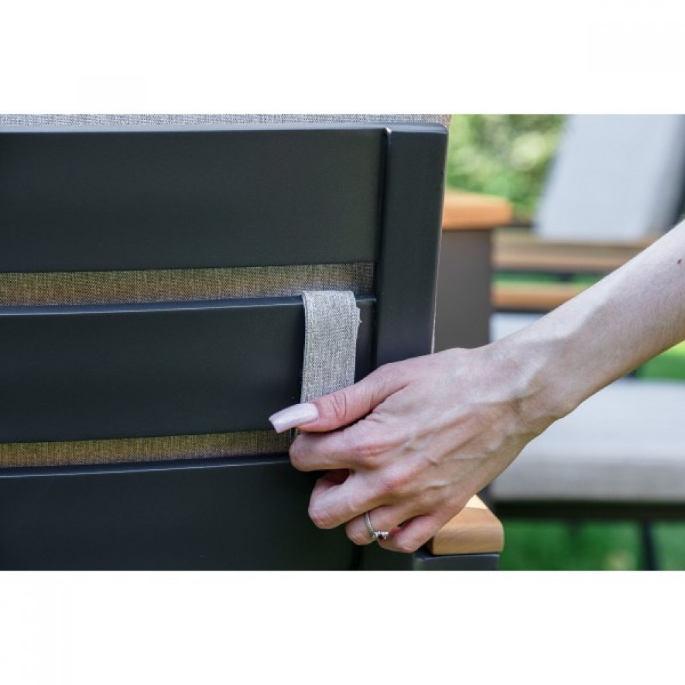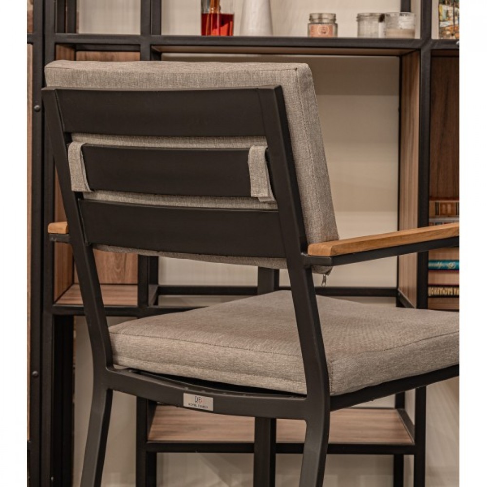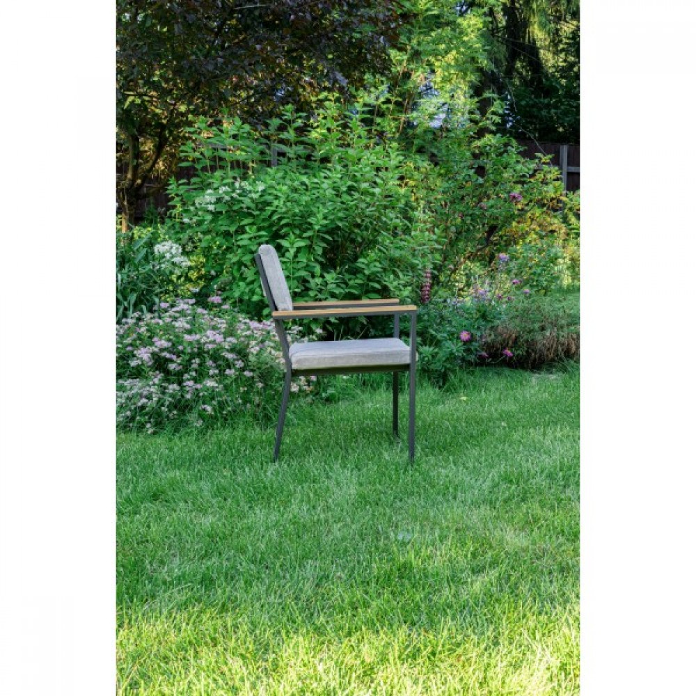 Основой кресла является алюминиевый каркас, который обеспечивает надежность и прочность конструкции. Подлокотники из натурального тика не только добавляют креслу изысканный вид, но и обеспечивают комфортную поддержку рук во время еды или отдыха.