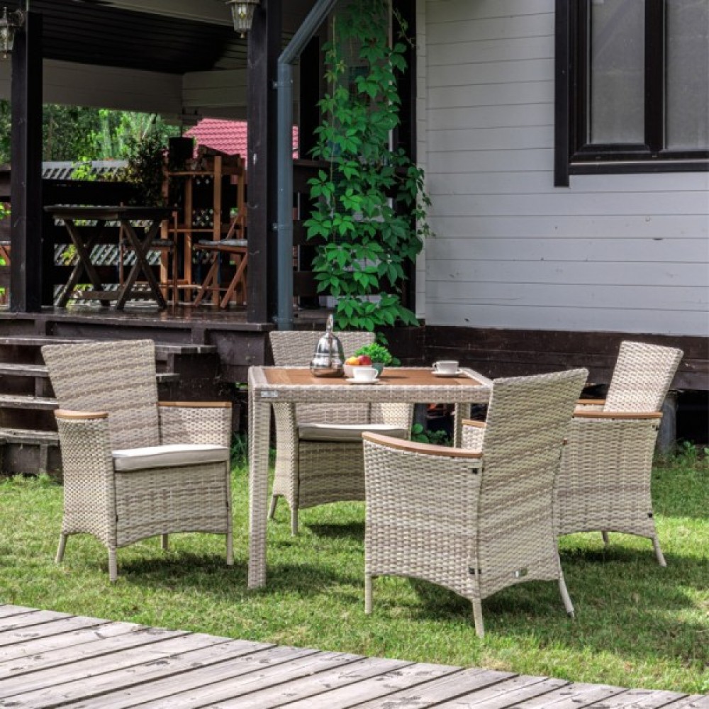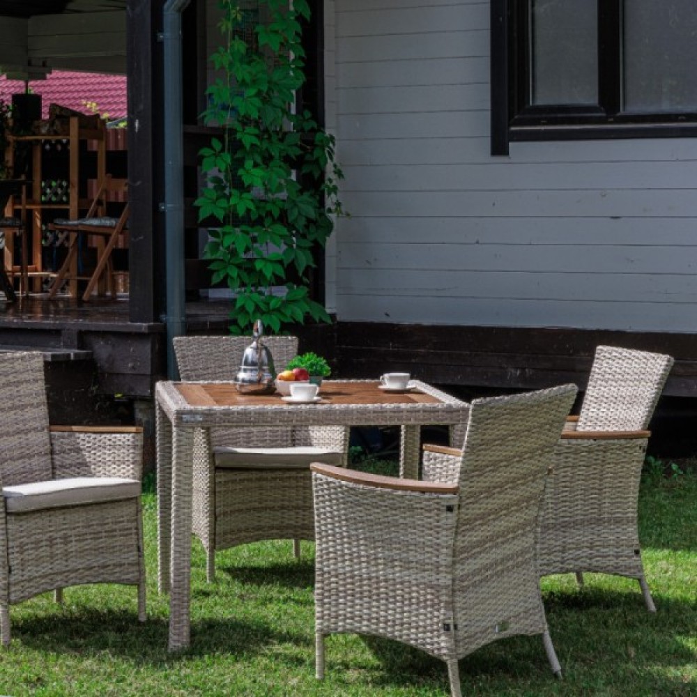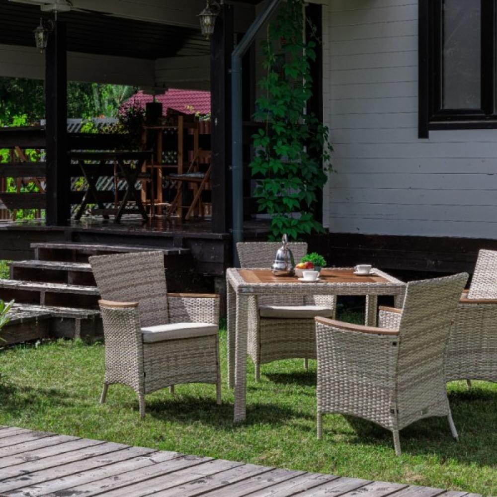 Включает в себя четрые кресла из искусственного ротанга на стальном каркасе и прочный стол.