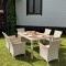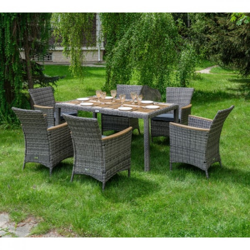 Включает в себя шесть кресел из искусственного ротанга на стальном каркасе и прочный стол.