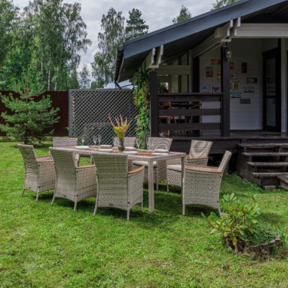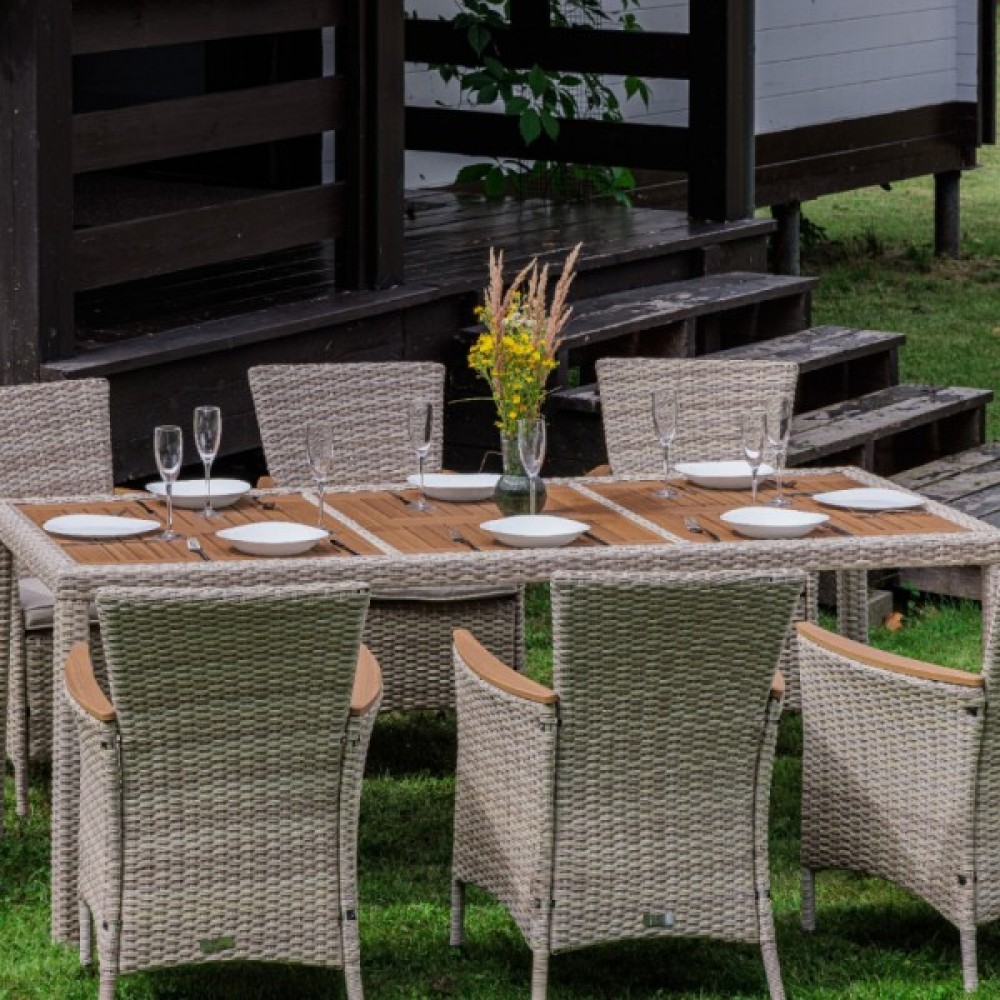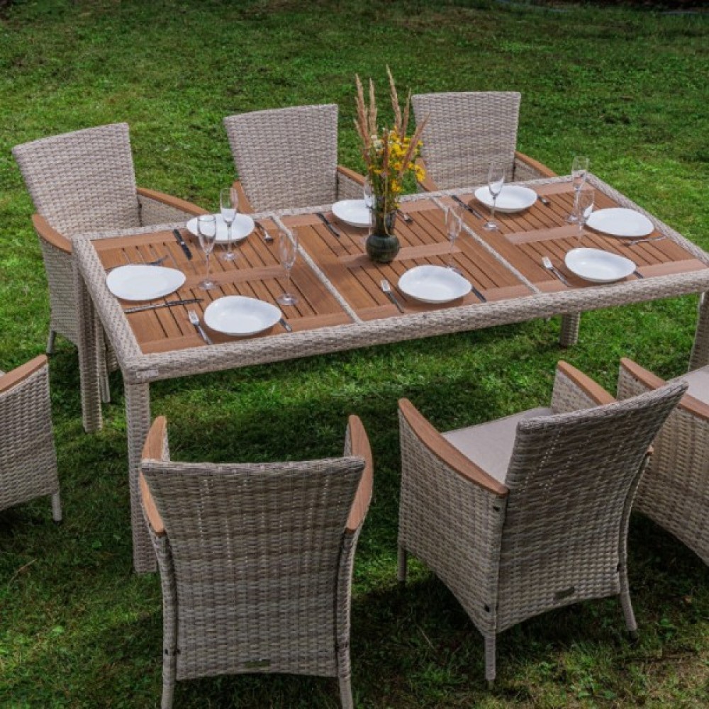 Включает в себя восемь кресел из искусственного ротанга на стальном каркасе и прочный стол.