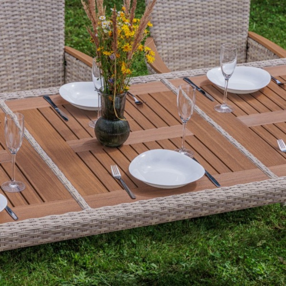 Комплект дополняет обеденный стол с элегантной столешницей, идеально подходящий для восьми человек.