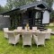 Включает в себя восемь кресел из искусственного ротанга на стальном каркасе и прочный стол.