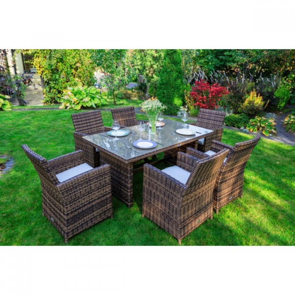 Обеденный комплект FIONA станет отличным решением для тех, кто предпочитает проводить летние вечера на улице в кругу друзей и семьи! Его габаритов вполне достаточно не только для ежедневных семейных трапез на свежем воздухе, но и праздничных застолий в больших компаниях.