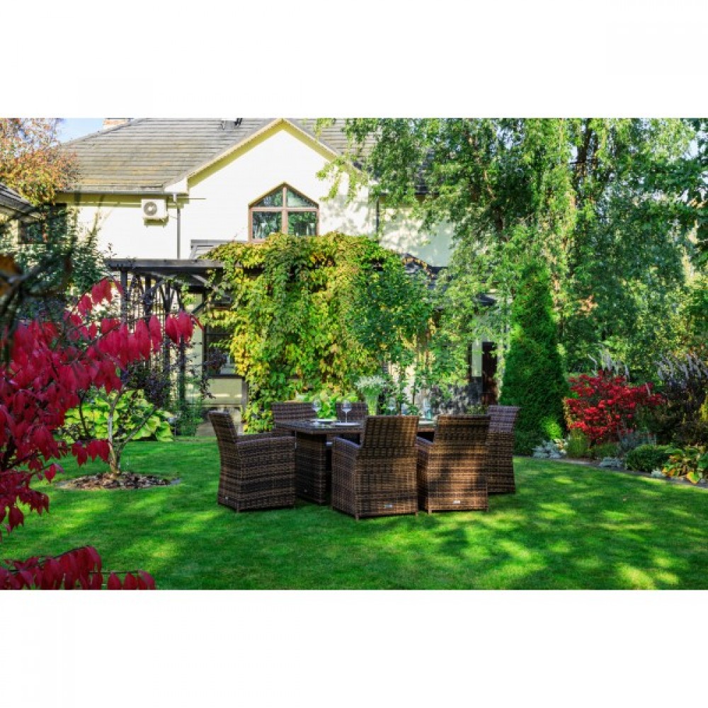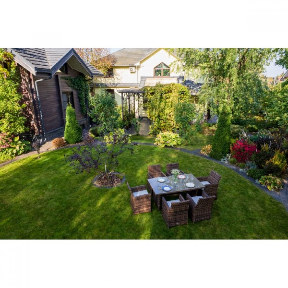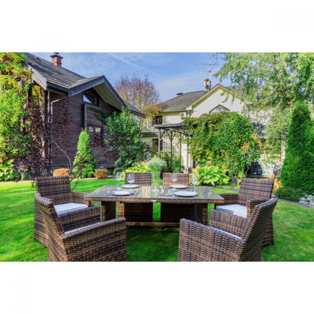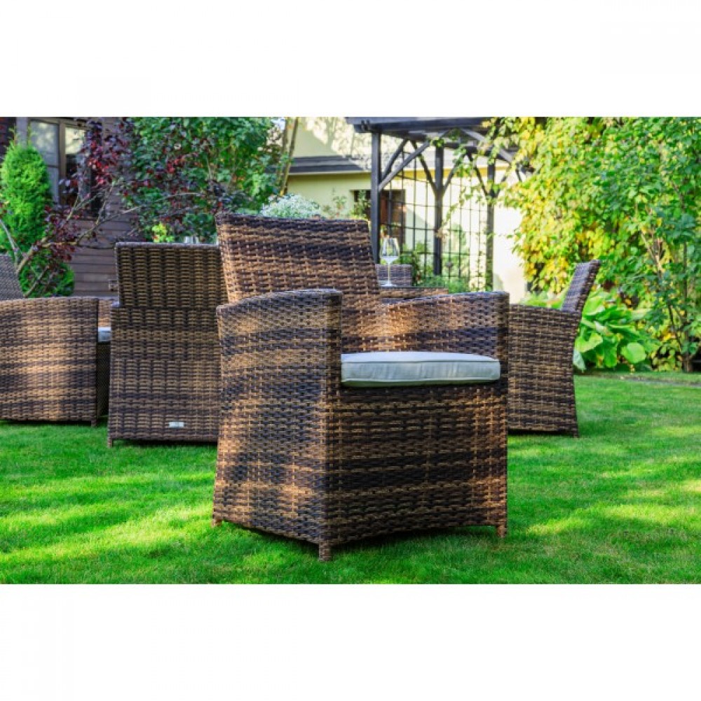 Сдержанный современный дизайн и использование нейтральных коричневых оттенков — преимущества комплекта. Этот набор садовой мебели будет гармонично смотреться в любом окружении. Он подходит для установки на террасе или веранде, в летней беседке или под открытым небом на Вашем участке.