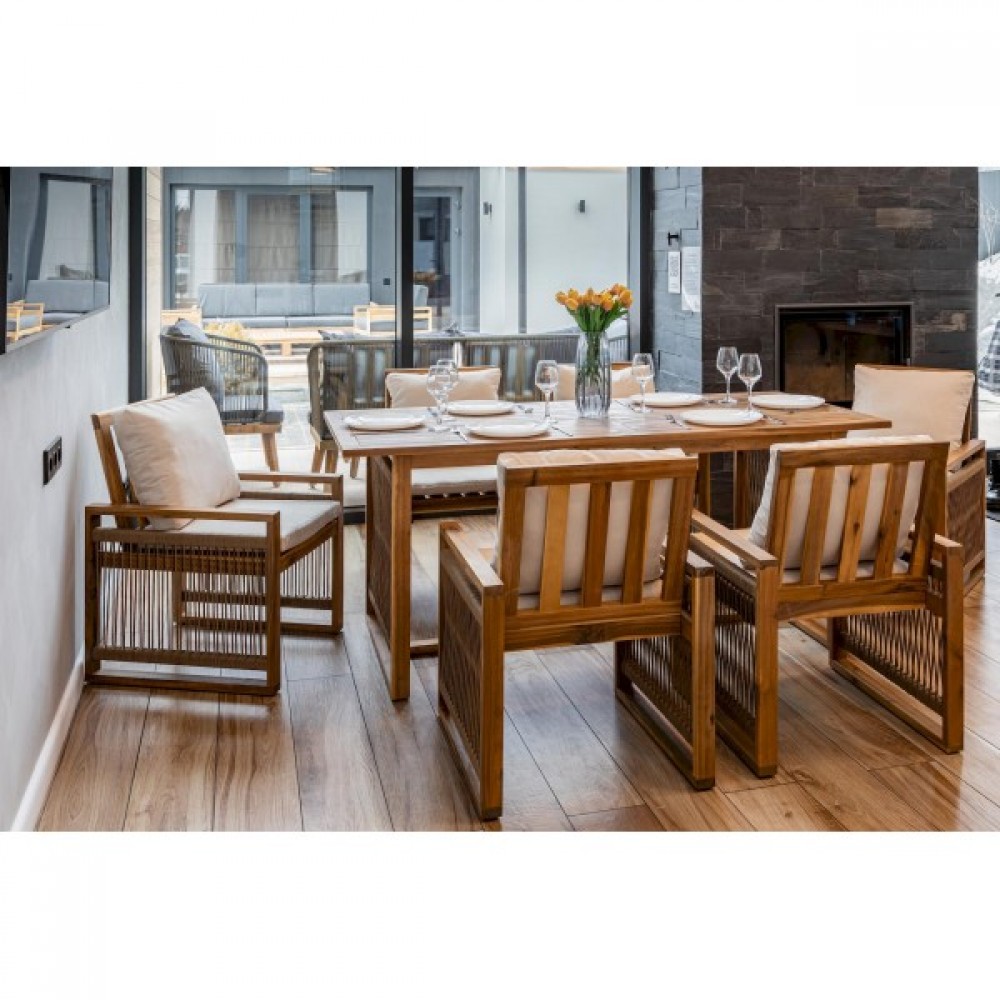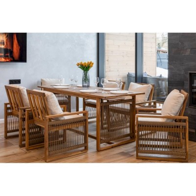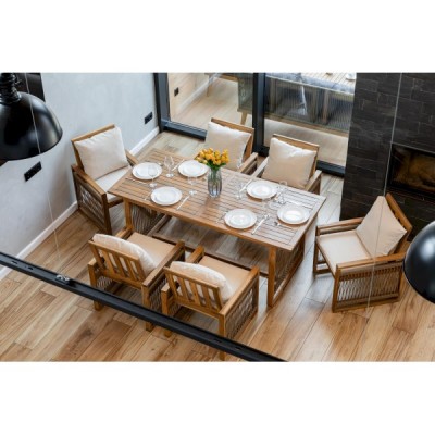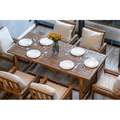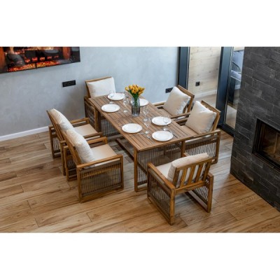 Представляем вам обеденный комплект из акации GRAND MICHELLE в бежевом цвете — идеальное решение для вашего уличного пространства. В комплект входит 6 элегантных обеденных кресел и стол, изготовленных из обработанной под тик акации. Этот материал не только имеет премиальный внешний вид, но и надежно защищен от влаги, что делает его отличным выбором для использования на открытом воздухе.