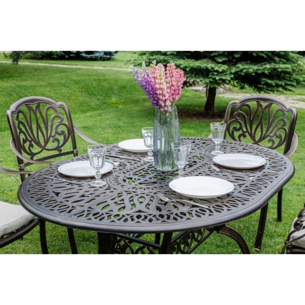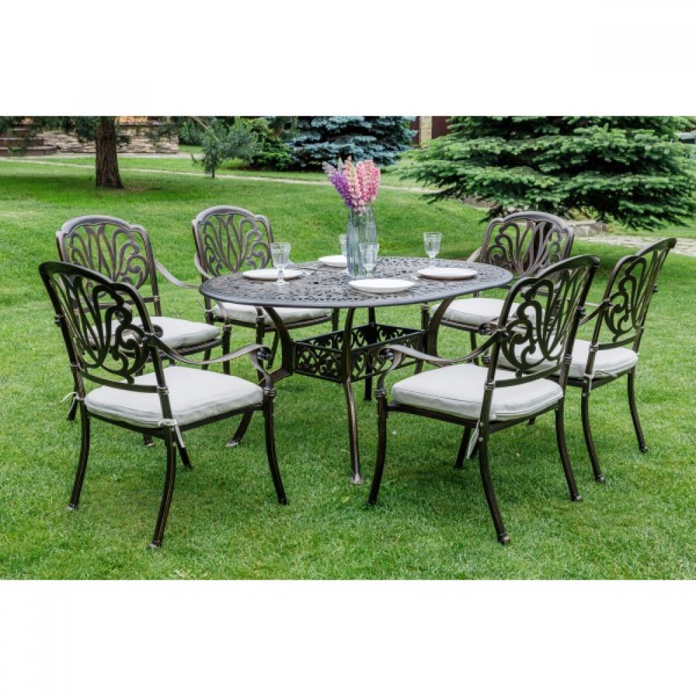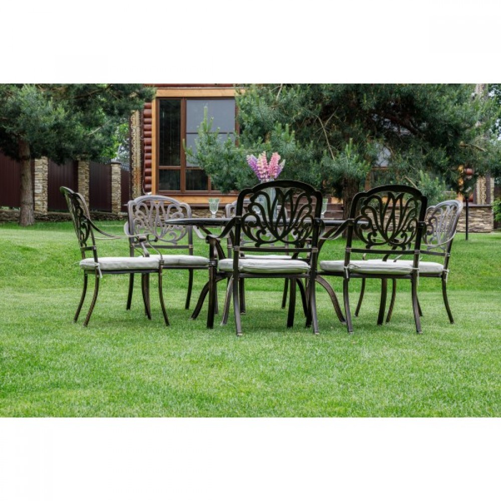 Эргономичный дизайн кресел обеспечивает комфортное сидение, а стильное исполнение придаст вашему саду или террасе особый шарм. Овальный стол с элегантным дизайном и прочной столешницей идеально дополнит общий вид комплекта.