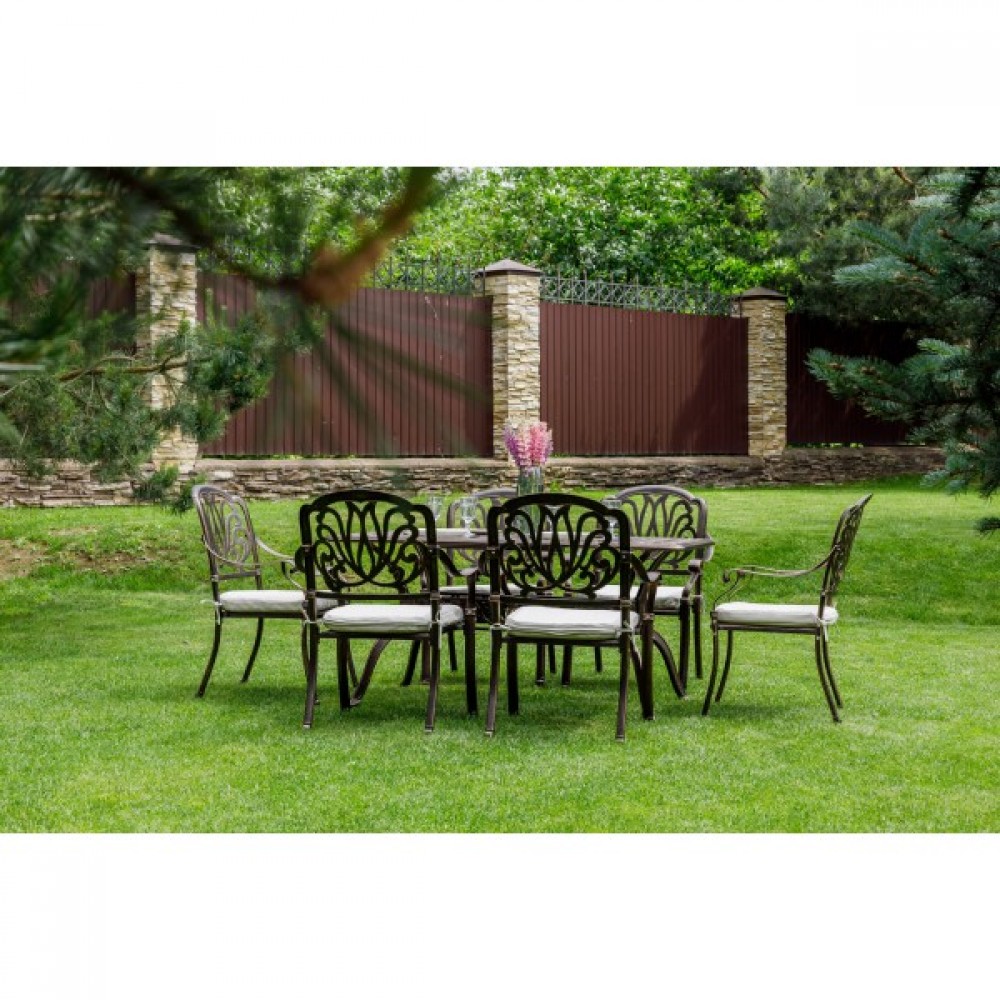 Включает в себя шесть элегантных кресла и прямоугольный стол.