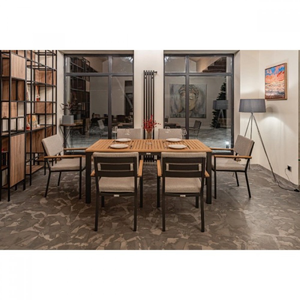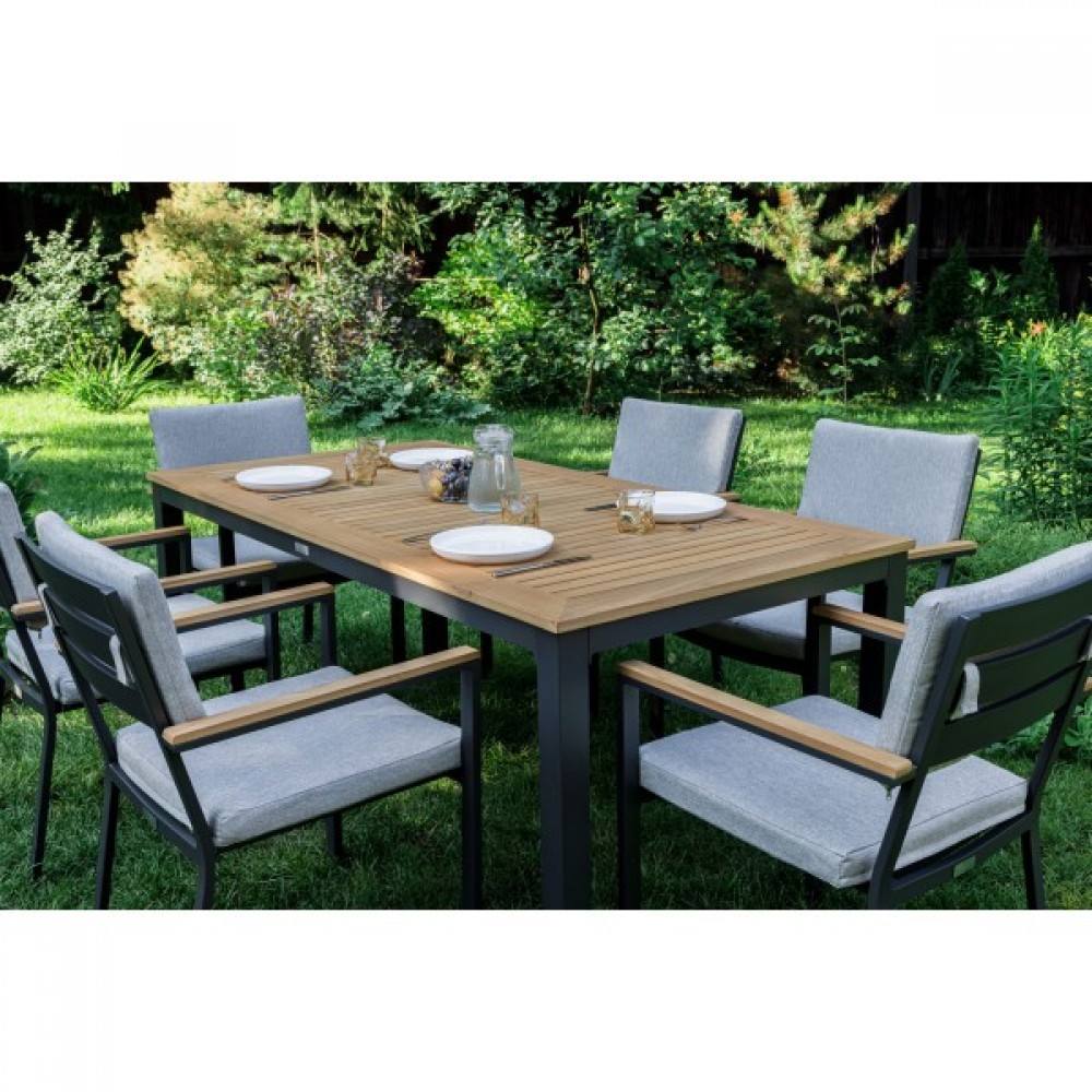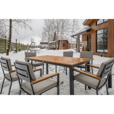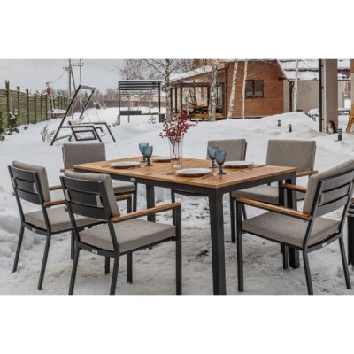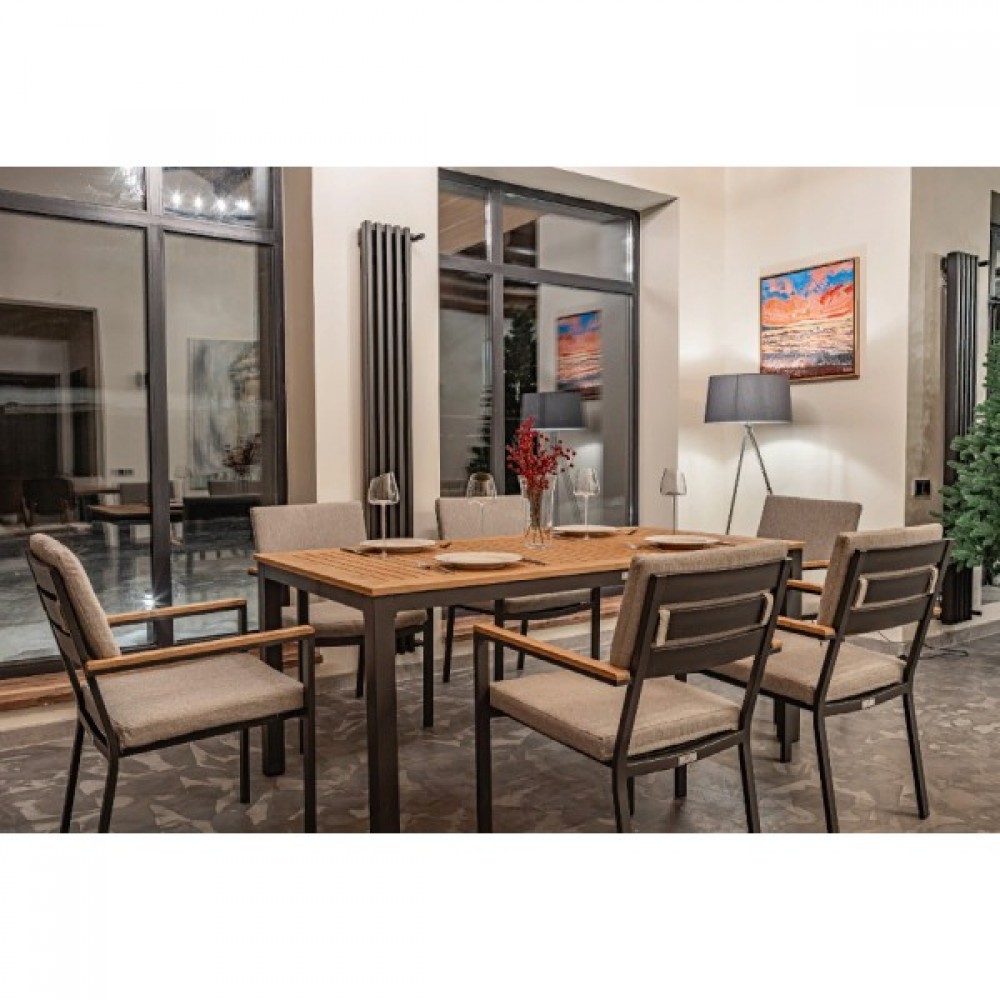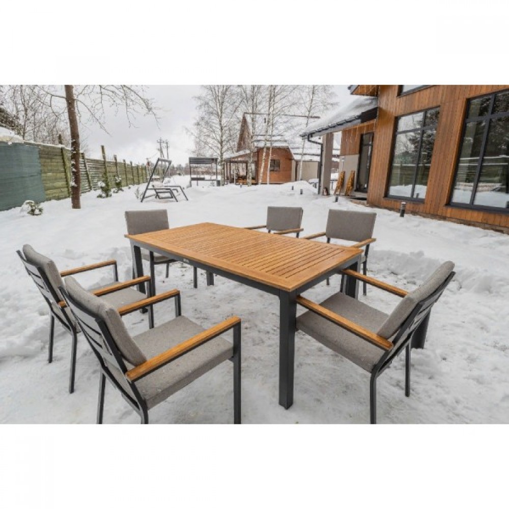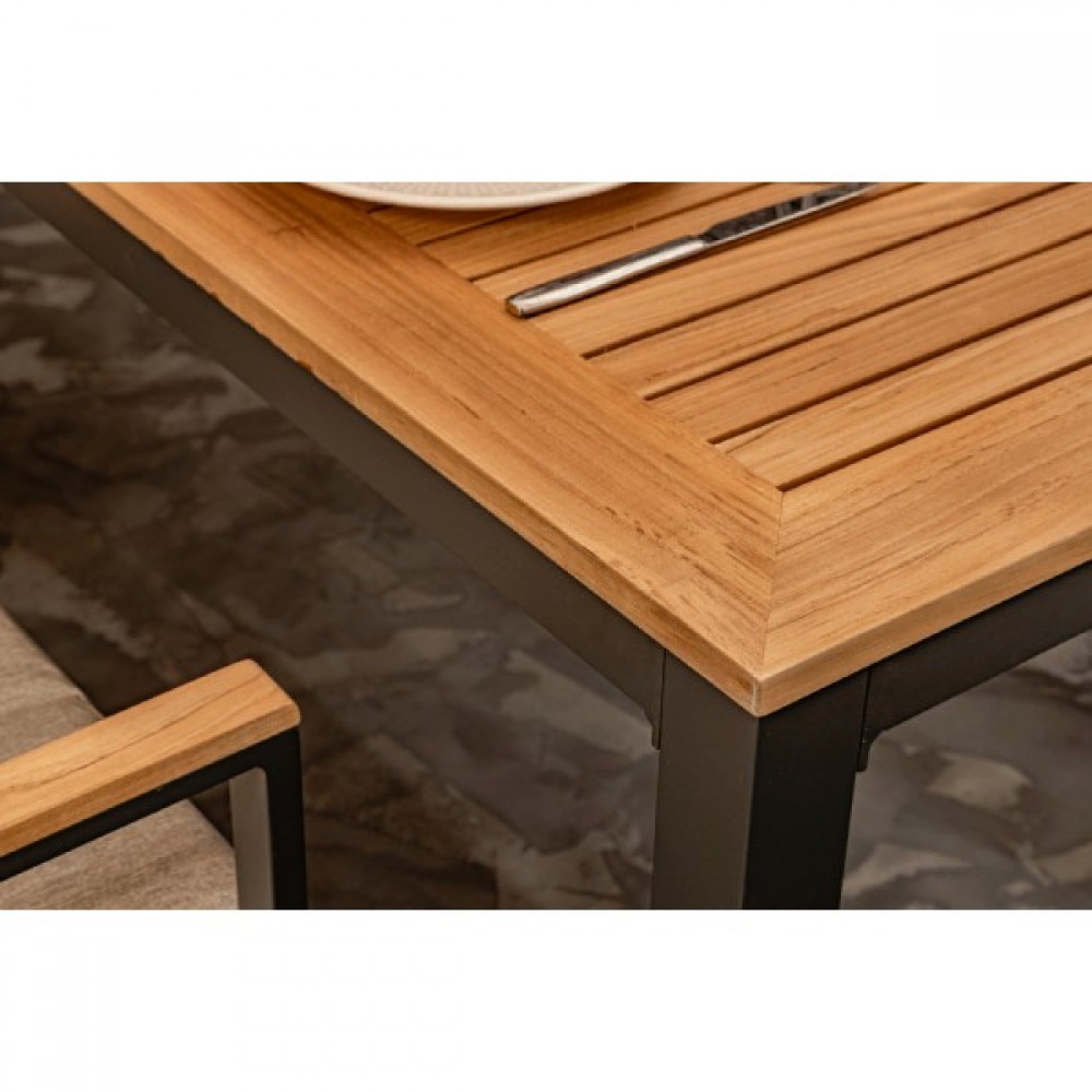 Столешница и подлокотники: Столешница выполнена из тика, что придает обеденному столу натуральный и изысканный вид. Тик также известен своей высокой стойкостью к влаге и ультрафиолетовому излучению, делая его идеальным для использования на открытом воздухе. Подлокотники кресел также выполнены из тика.
