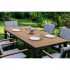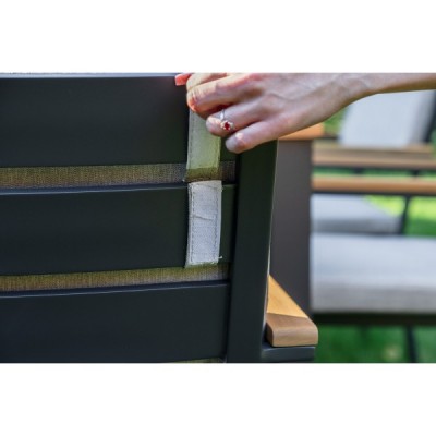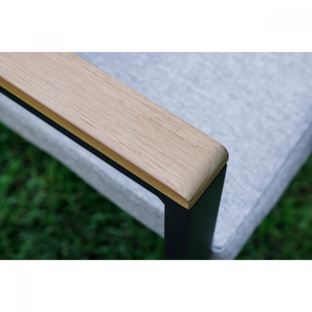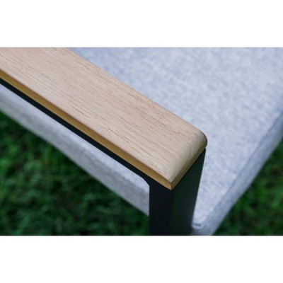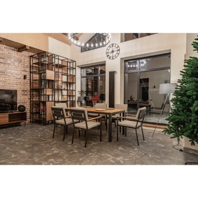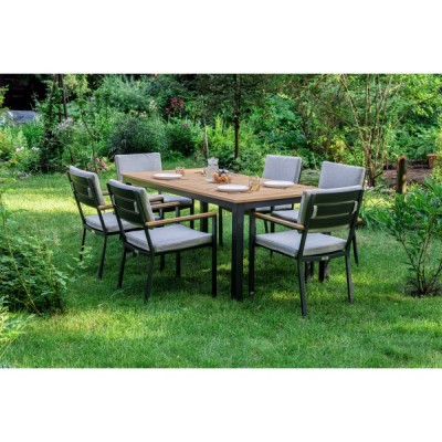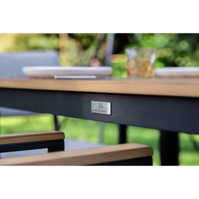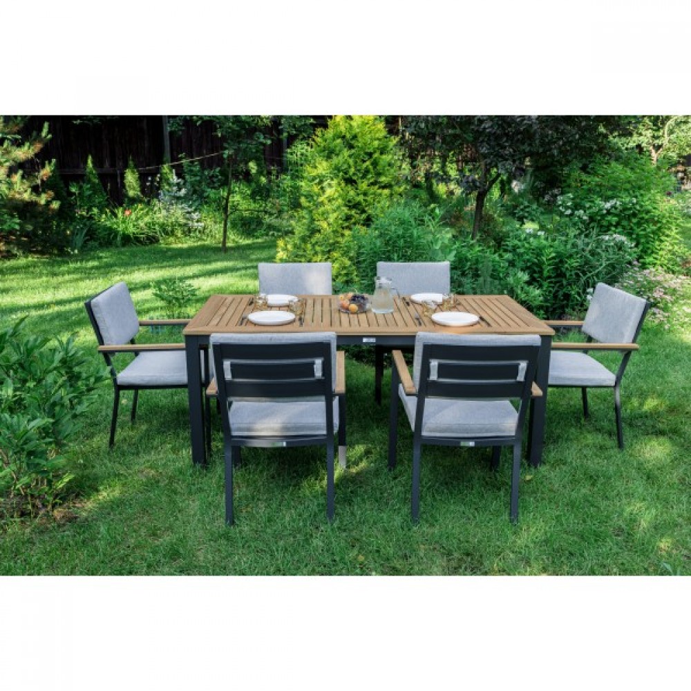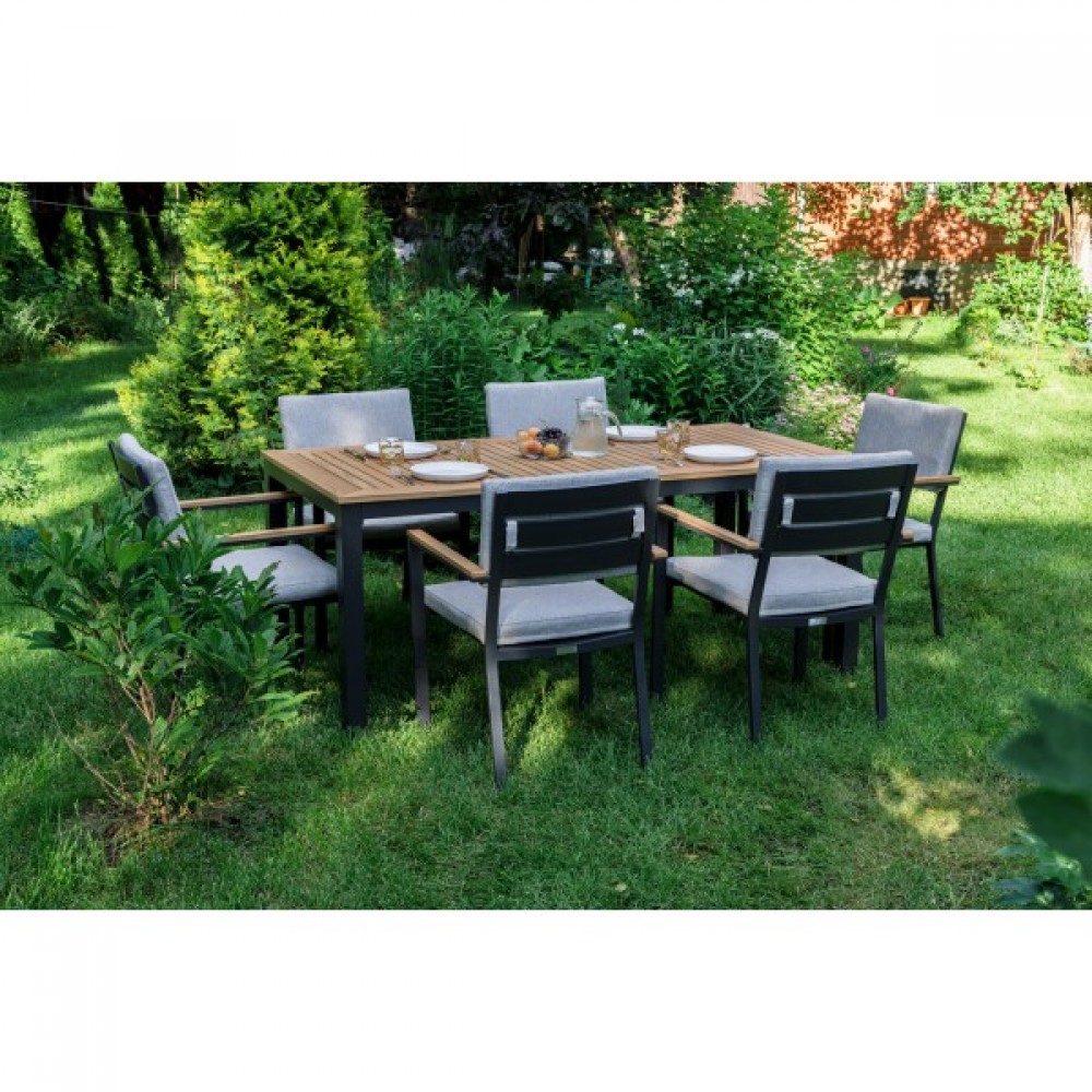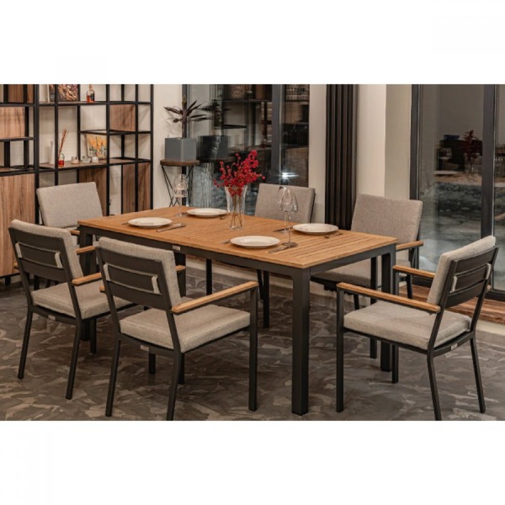 Столешница и подлокотники: Столешница выполнена из тика, что придает обеденному столу натуральный и изысканный вид. Тик также известен своей высокой стойкостью к влаге и ультрафиолетовому излучению, делая его идеальным для использования на открытом воздухе. Подлокотники кресел также выполнены из тика.