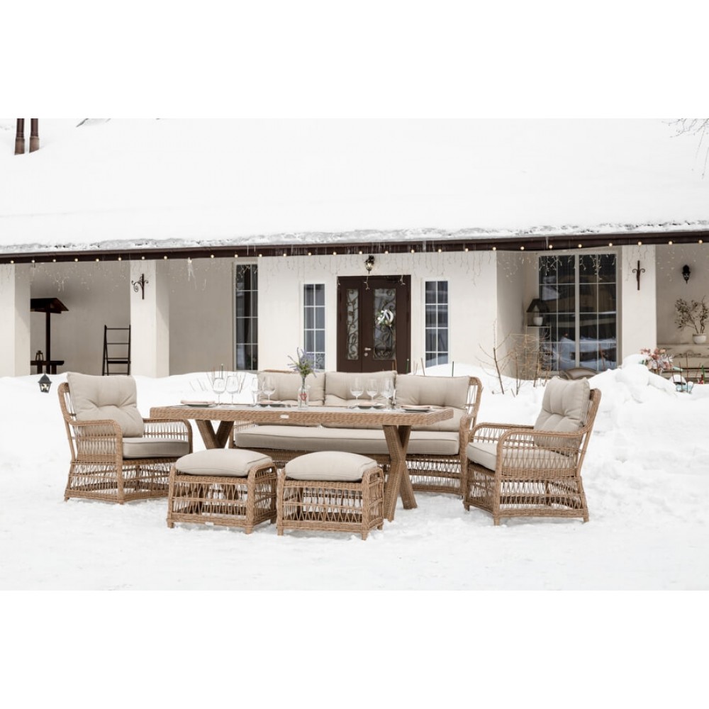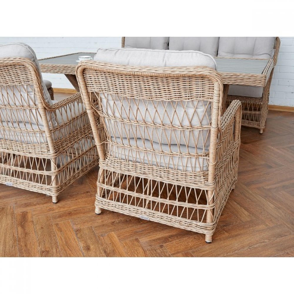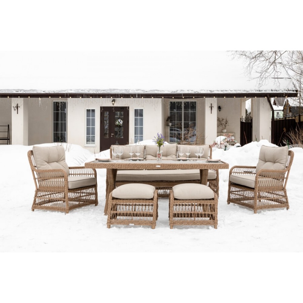 Комплект мебели ALBERT на 6 персон. Превосходное решение для летних веранд и террас загородных домов. Круглый искусственный ротанг натурального цвета на алюминиевом каркасе, ручное плетение. Благодаря использованию этих материалов комплект мебели ALBERT имеет особую прочность и очень востребован в нашем климате.