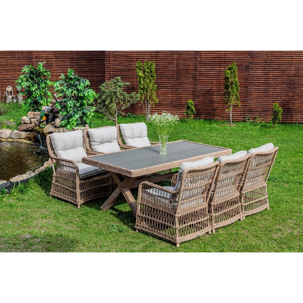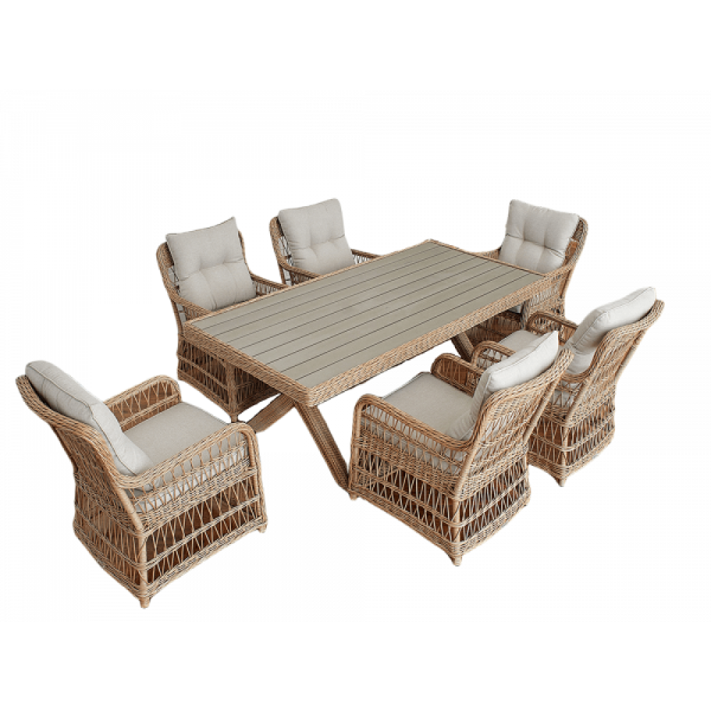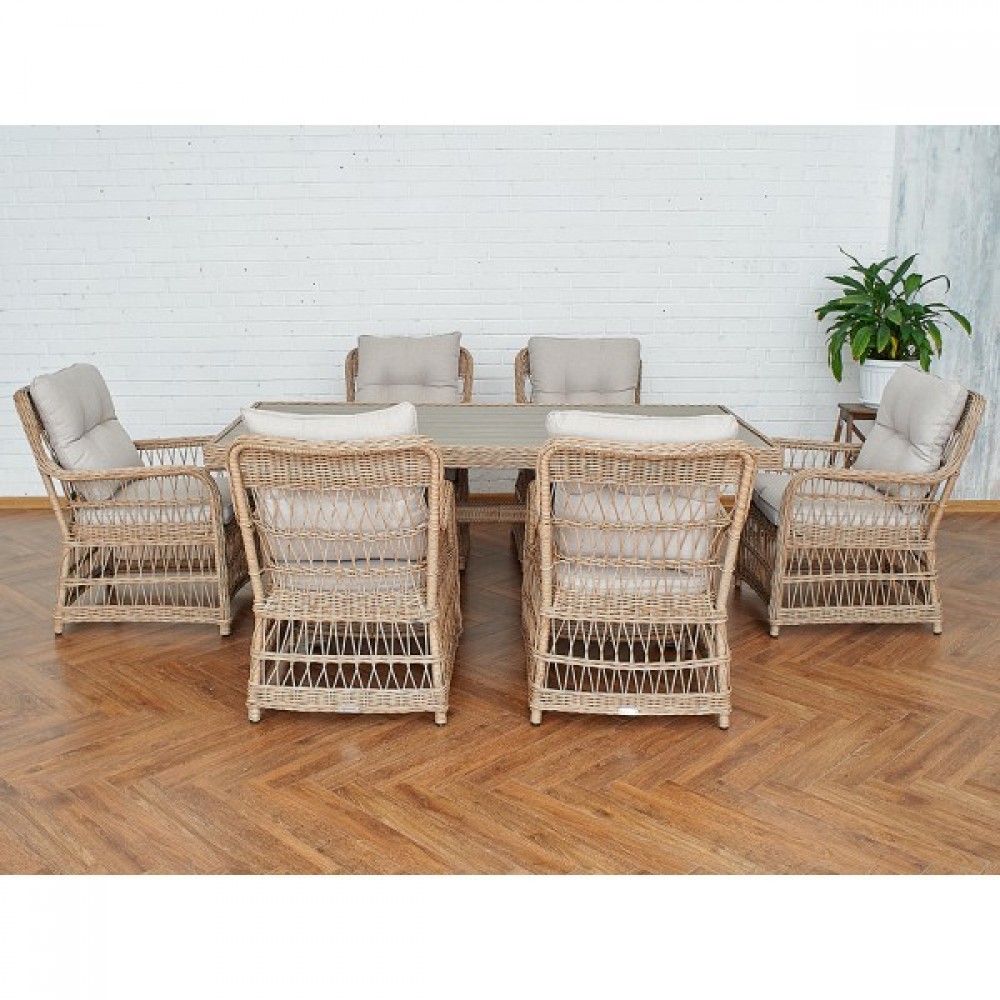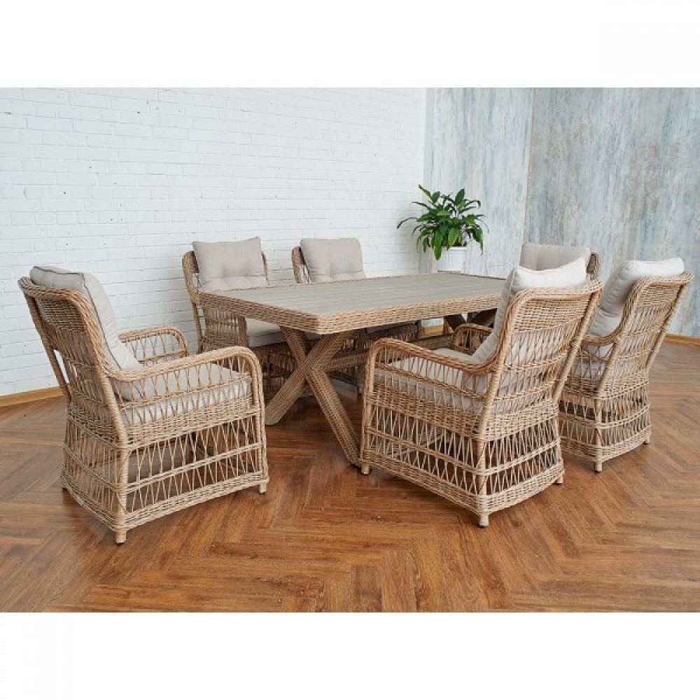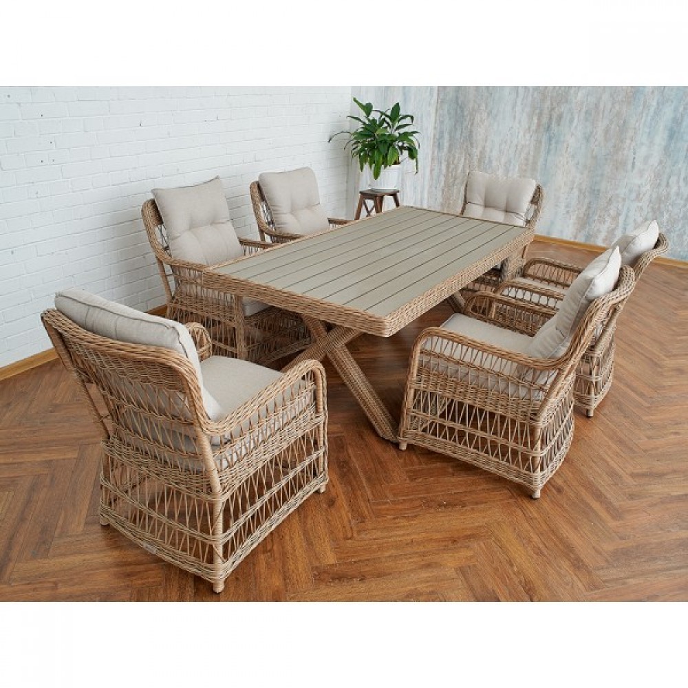 Комплект мебели из искусственного ротанга ИЗАБЕЛЛА на 6 персон, натуральный цвет, столешница из искусственного дерева, алюминиевый каркас, подушки входят в набор.