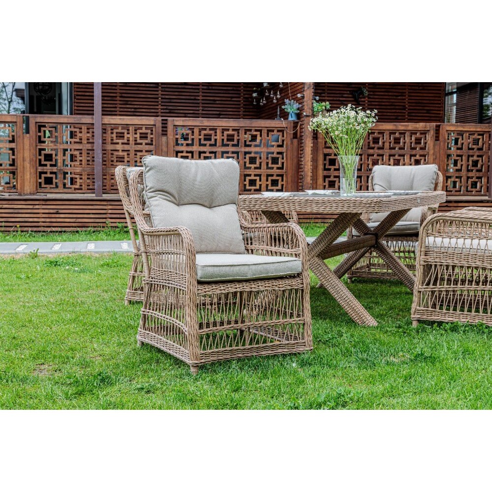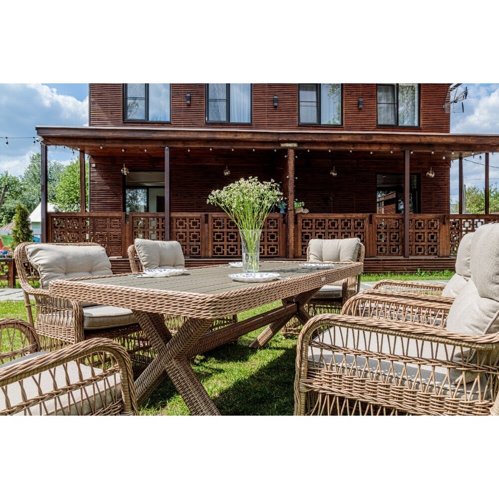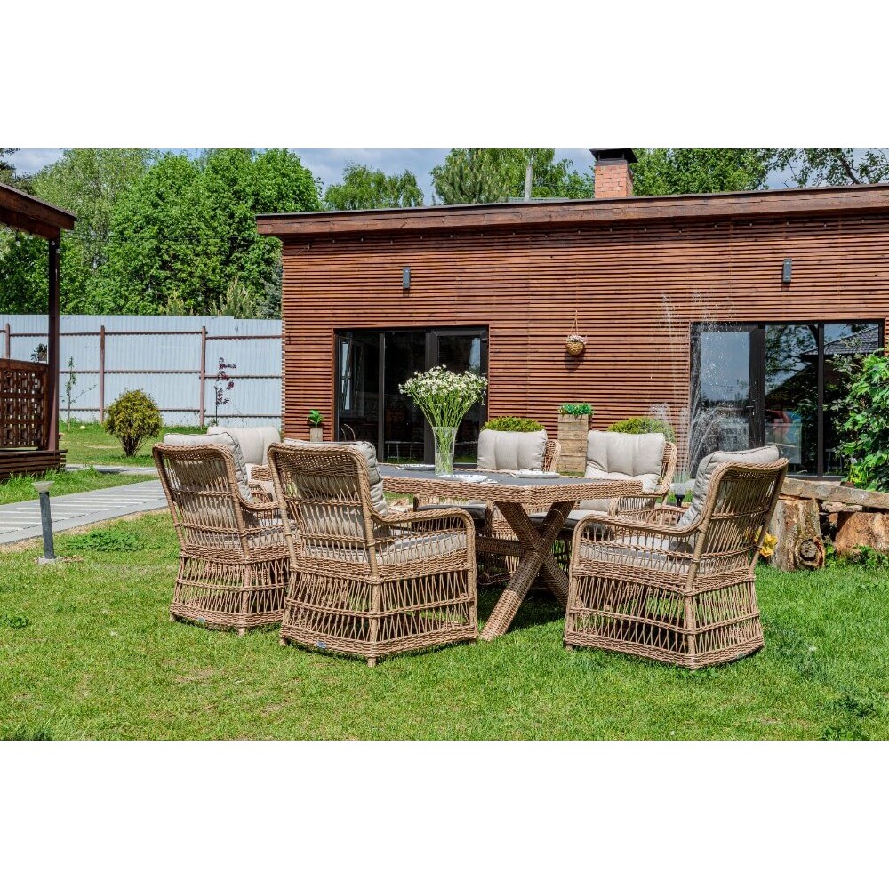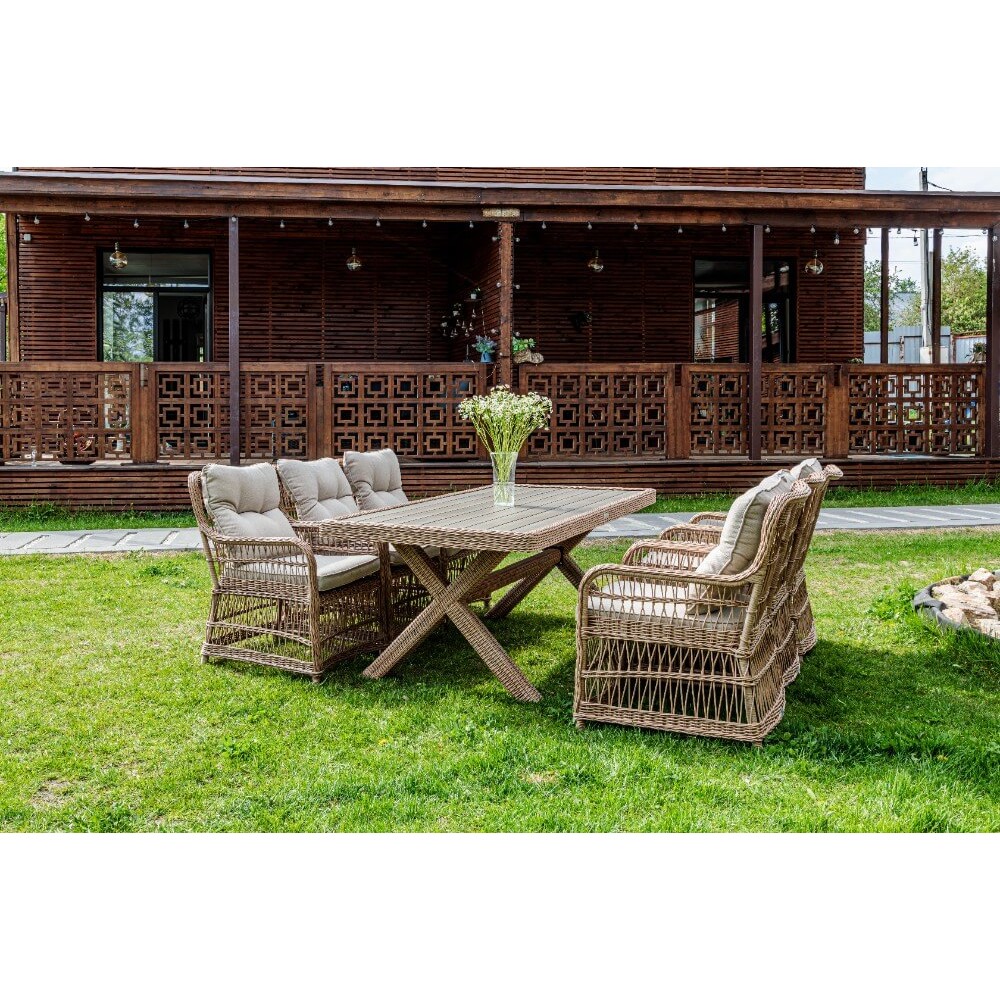 Комплект мебели из искусственного ротанга ИЗАБЕЛЛА на 6 персон, натуральный цвет, столешница из искусственного дерева, алюминиевый каркас, подушки входят в набор.