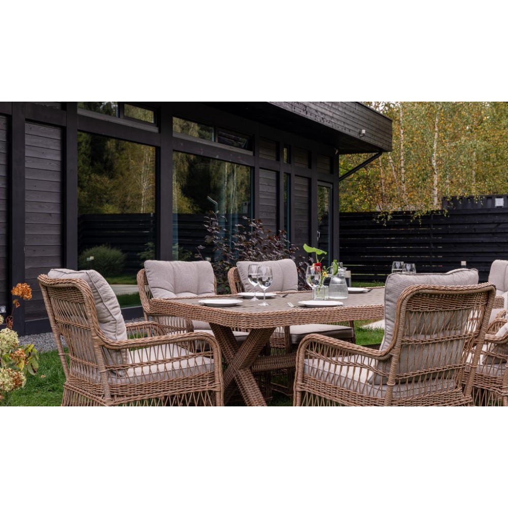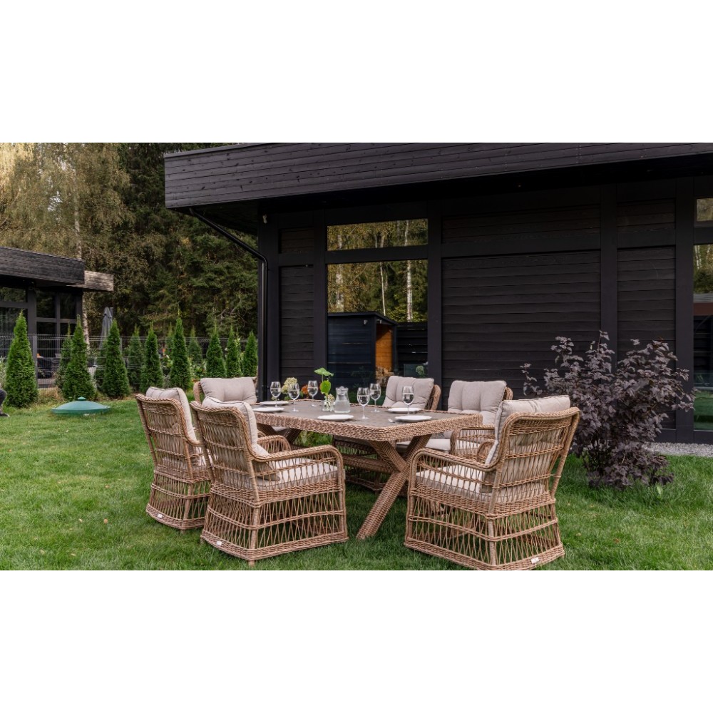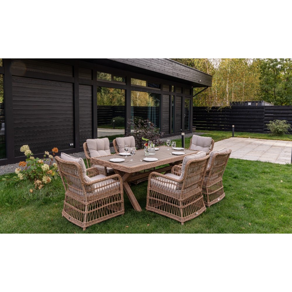 - Комплектация: 1 обеденный стол, 6 кресел с подлокотниками и подушками