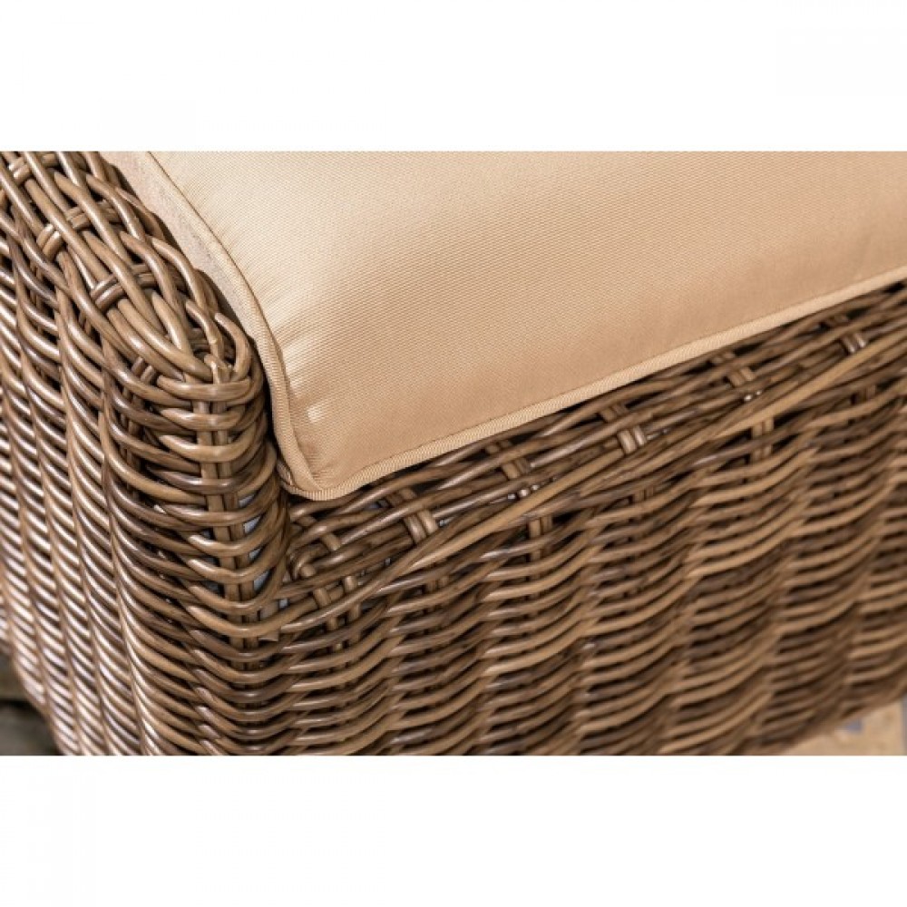 Круглое плетение под дерево дает интересный объем и фактуру, бежевые объемные подушки настраивают на хороший отдых.