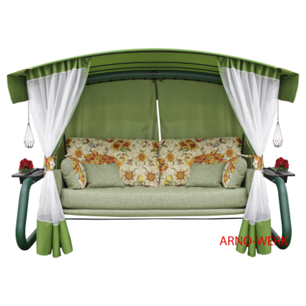 Вес в упаковке, кг: 106 Количество мест на качели: 4 Форма крыши: гнутая Диаметр трубы: 90 мм Особенности Максимальная нагрузка, кг: 1000 Диаметр трубы, мм: 90 Цвет и материал тента: Тент Люкс. Ткань - Oxford 600. Само полотно тента выполнено с использованием воланов декоративного вида Комплектация: Каркас с гнутой крышей, большие подстаканники с подставкой под цветы (2 шт.), тентодержатели (2 шт.), подсвечники (2 шт.). Тент Люкс, диван, дополнительные подушки (всего 4 шт.), дополнительный чехол-укрытие для защиты мягких элементов качели из ткани с водоотталкивающей пропиткой, дополнительный съемный чехол-укрытие для защиты сидения из смесовой ткани+ Рогожка. В комплект входит специальный флакон с кисточкой для подкраски деталей каркаса, если случайно будет повреждена поверхность. Кроме того, прилагается специальная салфетка для полировки Штрихкод: 4680004883081 Подвесы: Витые стальные подвесы с навивкой в 4 ручья. Количество мест: 4 Подстаканник: Двухзонные подстаканники с вставками из ценных пород дерева Москитная сетка: Люкс-класса со вставками по низу плотной ткани Oxford 600 Регулировка спинки: Нерегулируемая Подушки: Дополнительные мягкие подушки из гобеленовой ткани и ткани Рогожка (4 шт.) Навес: да Габариты, мм (ДхШхВ): 2940х1700х1900 Габариты в упаковке, мм: Коробка №1 2700х650х260; Коробка №2 2100х960х300; Коробка №3 2100х850х300 Бесплатная доставка: Да Наполнение матраса: комбинированный наполнитель - поролон + синтепон; общая толщина 170 мм Подвесы: Впервые в конструкции качелей использованы витые стальные подвесы из трубы диаметром 25 мм, изготовленные на новейшем трубозавивочном станке модели SQR301 (Тайвань). Навивка выполнена в 4 ручья с шагом 200 мм. 4 подвеса надежно связывают подшипниковые узлы с подвесным диваном через 4 специальные пружины производства Италии диаметром 50 мм и проволокой 4 мм. Такая конструкция позволяет амортизировать нагрузки и придает особую мягкость при посадке на диван и раскачивании. Подшипниковый узел: Новый подшипниковый узел сочетает в себе изящный внешний вид, высочайшую прочность и надежность, а также бесшумность и мягкость в работе. Он идеально защищен от загрязнений, не требует смазки и обслуживания. Корпус подшипника изготовлен из стального круглого проката диаметром 60 мм методом высокоточной токарной обработки. Сдвоенные радиальноупорные подшипники, закрепленные на оси из нержавеющей стали марки AISI304 способны выдержать нагрузку по 800 кг каждый. Сидение дивана: размер 2000х800, толщина подушек сидения дивана 200 мм" />