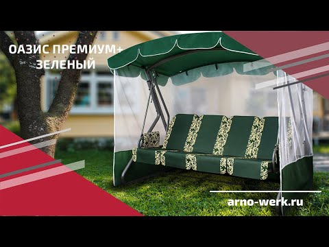 Каркас садовых качелей Arno Werk Оазис Премиум Плюс зеленый изготовлен из металлической трубы диаметром 51 мм с максимальной нагрузкой 380 кг. В комплект входят - удобные сидения с чехлами из ткани с водоотталкивающей пропиткой; наполнение матраса холлофайбер, толщиной 60 мм.; мягкие подлокотники; тент Премиум из высокопрочной ткани Оксфорд 210. Угол наклона спинки регулируется звеньями цепи. Качели раскладываются в полноценную кровать. В разложенном состоянии спинка жестко крепится к задней перекладине с помощью фиксаторов.