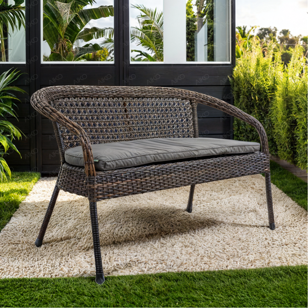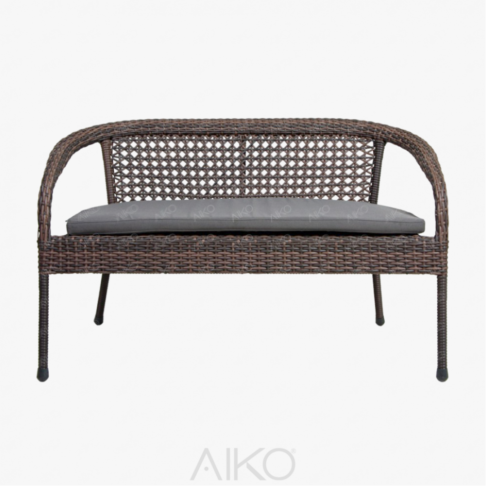 Садовый диван 2-х местный DECO, серо-коричневый к комплектам DEСO. Прочный стальной каркас, окрашенный порошковым методом. Нить плоская. Экоротанг высшего качества. Изделие не боится влаги, прямых солнечных лучей, мороза. Температура эксплуатации от -16 до + 50. Легко моется. Не требует особого ухода. Гарантия 2 года. Подушки можно приобрести у нас отдельно.