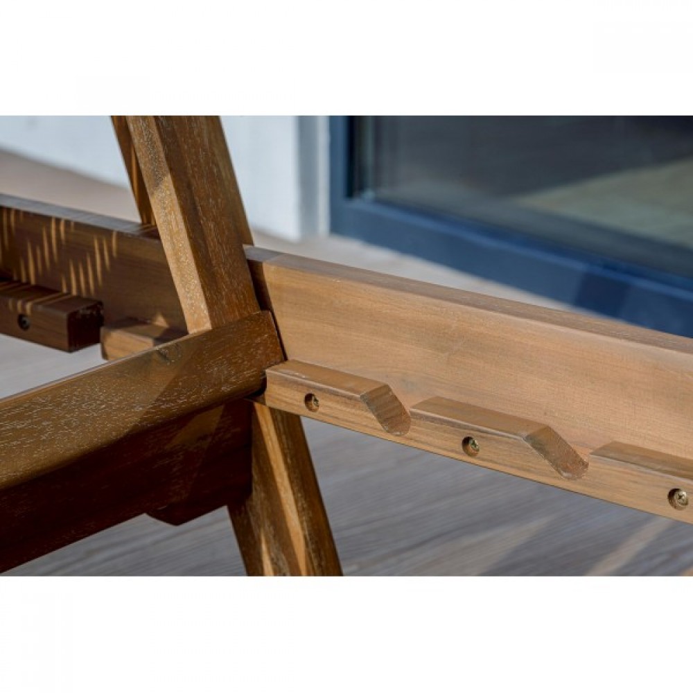 Шезлонг имеет размеры 200х73х55 см, что обеспечивает комфортное положение для отдыха. Изготовлен из натуральной акации с оттенком тика и обработан тиковым маслом для долговечности.