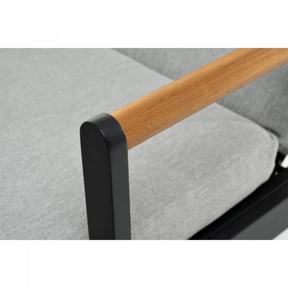 MAYA – современная коллекция садовой мебели из алюминия, выполненная в комбинации алюминия, натурального тика и подушек из водоотталкивающей ткани Olefin в светло-серых тонах.