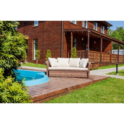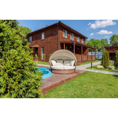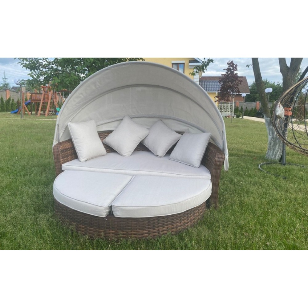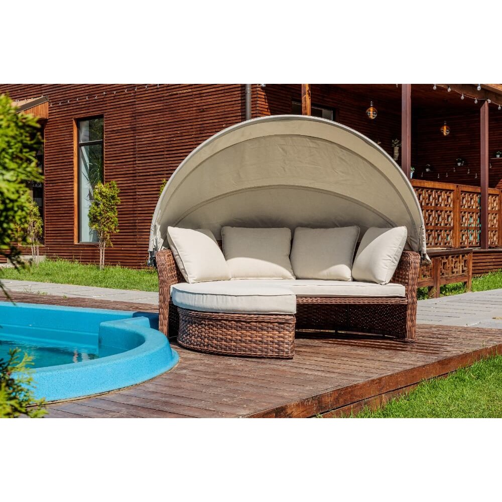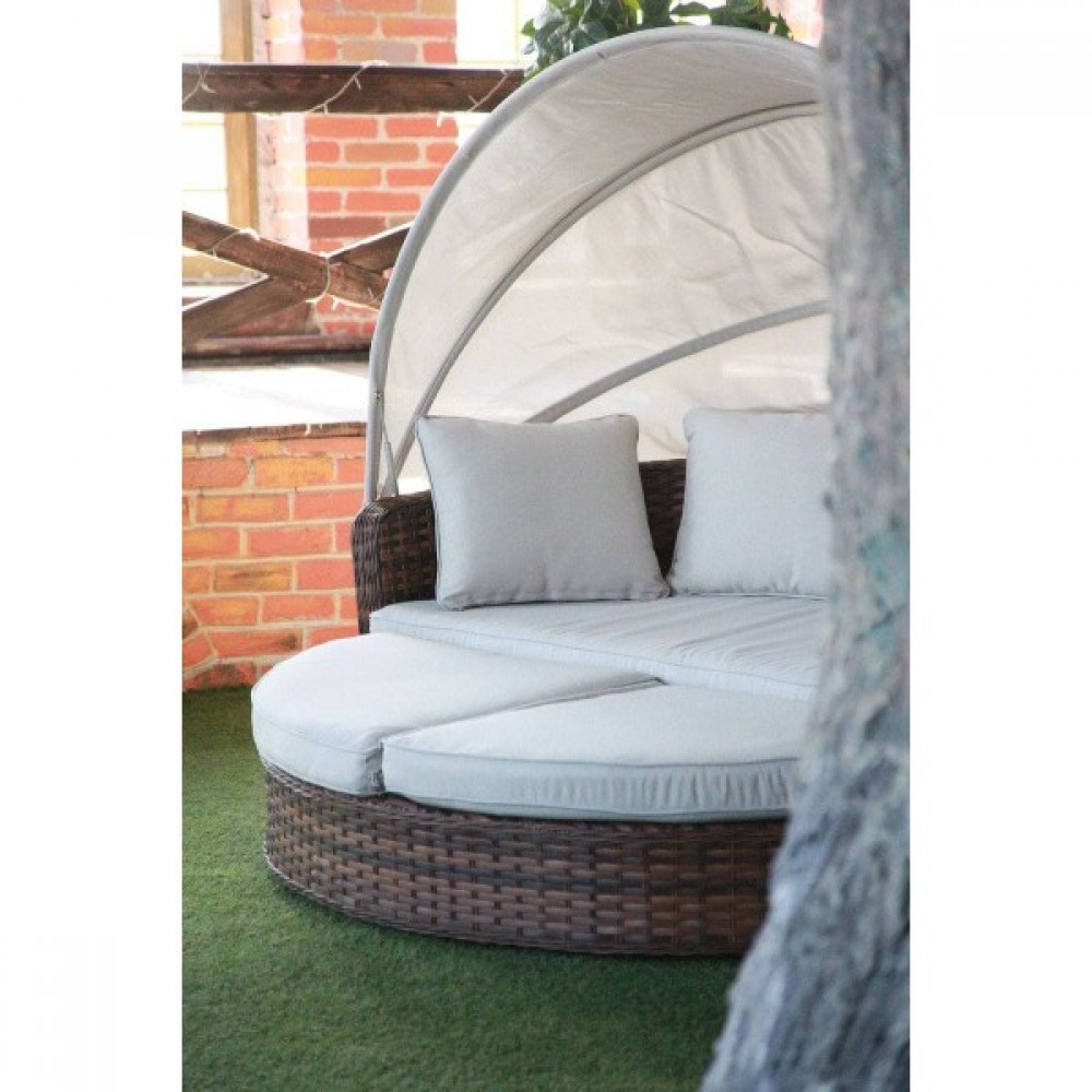 Круглый шезлонг легко трансформируется в компактный полукруглый диван, а солнцезащитный козырек позволит вам наслаждаться свежим воздухом даже в самый знойный летний день.