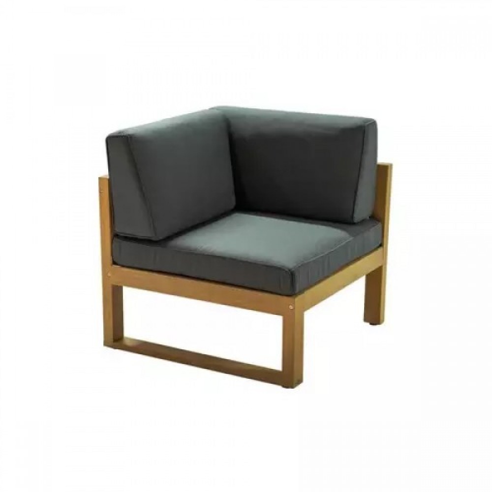Коллекция BOOKA. Материал — массив акации, отделка экомаслом под натуральный тик. Анодированная фурнитура из нержавеющей стали. Подушки в комплекте, ткань подушек – Olefin, цвет подушек темно-серый графит.
